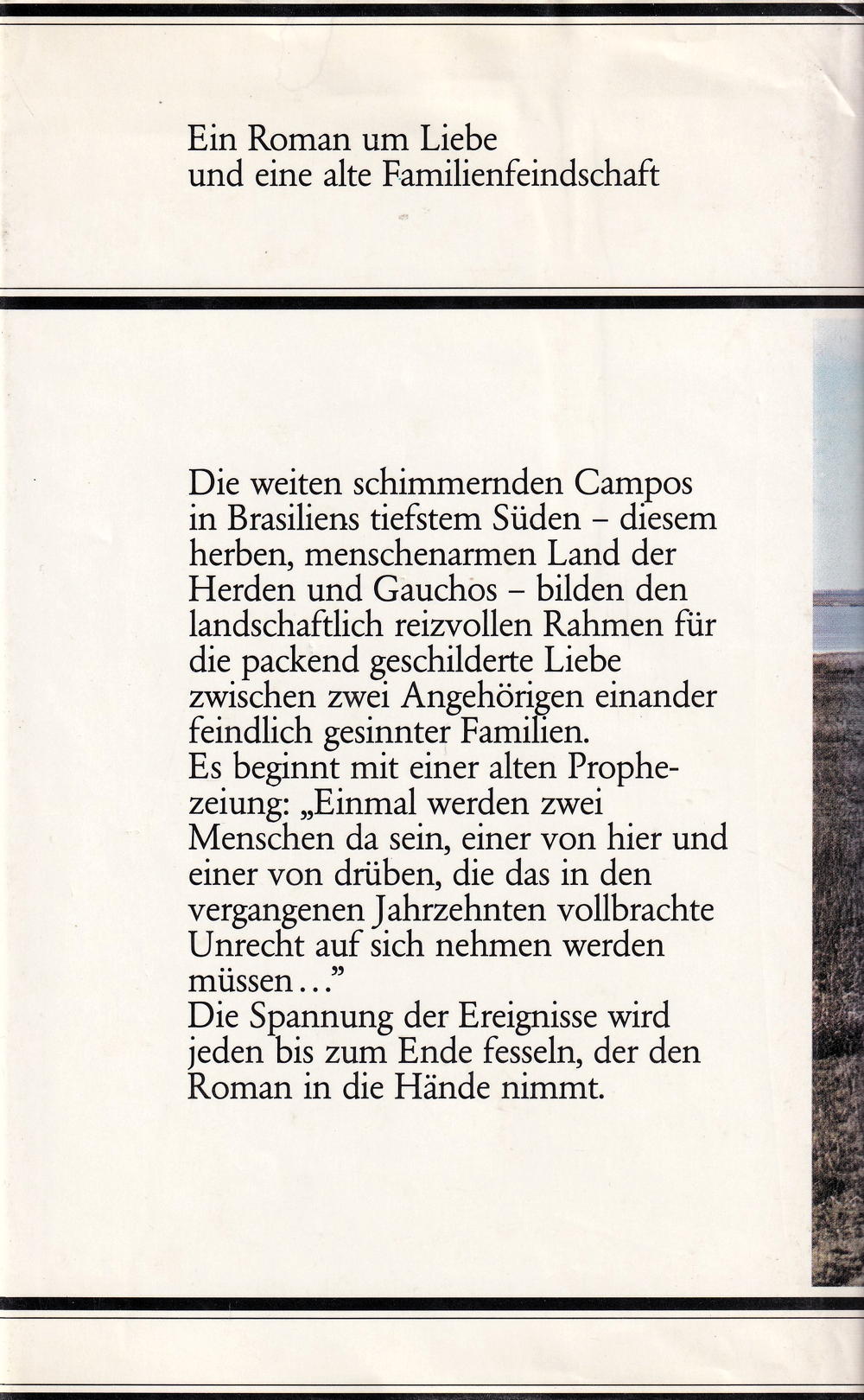 Die weiten schimmernden Campos in Brasiliens tiefstem Süden - diesem herben, menschenarmen Land der Herden und Gauchos - bilden den landschaftlich reizvollen Rahmen für die packend geschilderte Liebe zwischen zwei Angehörigen einander feindlich gesinnter Familien.