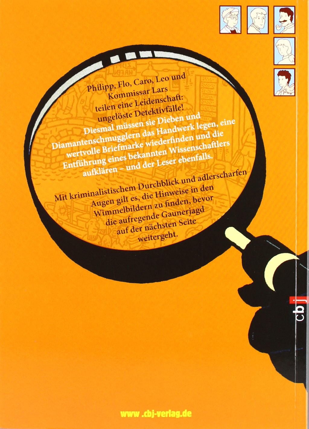 Philip, Flo, Caro, Leo und Kommissar Lars teilen eine Leidenschaft: ungelöste Detektivfälle! Diesmal müssen sie Dieben und Diamanten-Schmugglern das Handwerk legen, eine wertvolle Briefmarke wieder finden und die Entführung eines bekannten Wissenschaftlers aufklären. Mit kriminalistischem Durchblick und adlerscharfen Augen gilt es, die entscheidenden Hinweise in den Wimmelbildern zu finden, bevor die aufregende Gaunerjagd auf der nächsten Seite weitergehen kann.