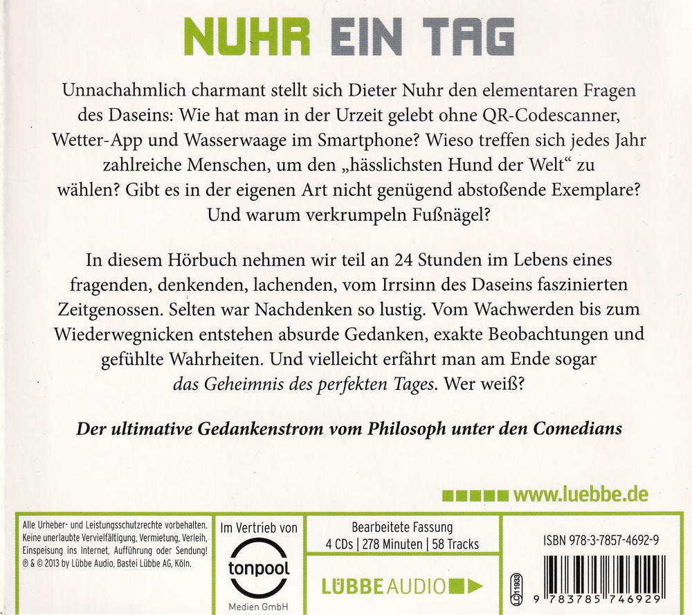 In diesem Hörbuch nehmen wir teil an 24 Stunden im Lebens eines fragenden, denkenden, lachenden, vom Irrsinn des Daseins faszinierten Zeitgenossen. Selten war Nachdenken so lustig. Vom Wachwerden bis zum Wiederwegnicken entstehen absurde Gedanken, exakte Beobachtungen und gefühlte Wahrheiten. Und vielleicht erfährt man am Ende sogar das Geheimnis des perfekten Tages. Wer weiss?