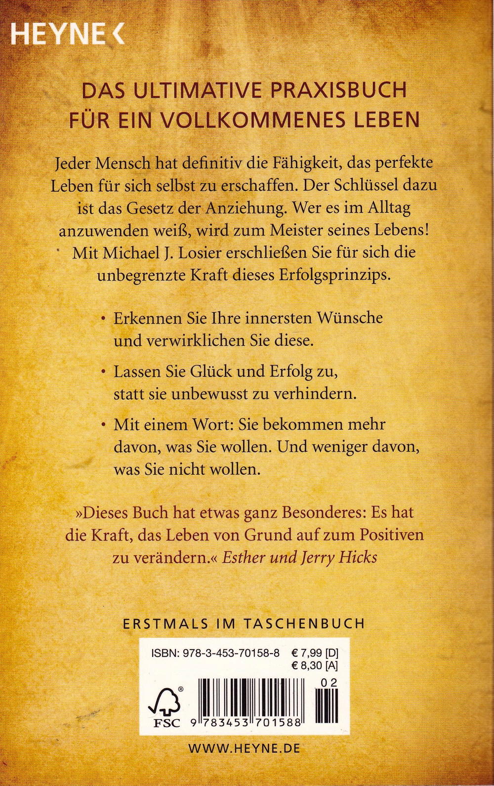 Jeder Mensch hat die unbegrenzte Fähigkeit, für sich das perfekte Leben zu erschaffen! Der Schlüssel dazu ist das Gesetz der Anziehung, das unser Leben stärker bestimmt als alles andere. Wer dieses Gesetz im Alltag anzuwenden weiss, wird zum wahren Meister seines Lebens. Michael J. Losier erschliesst ganz praktisch die unglaubliche Kraft dieses Erfolgsprinzips:
