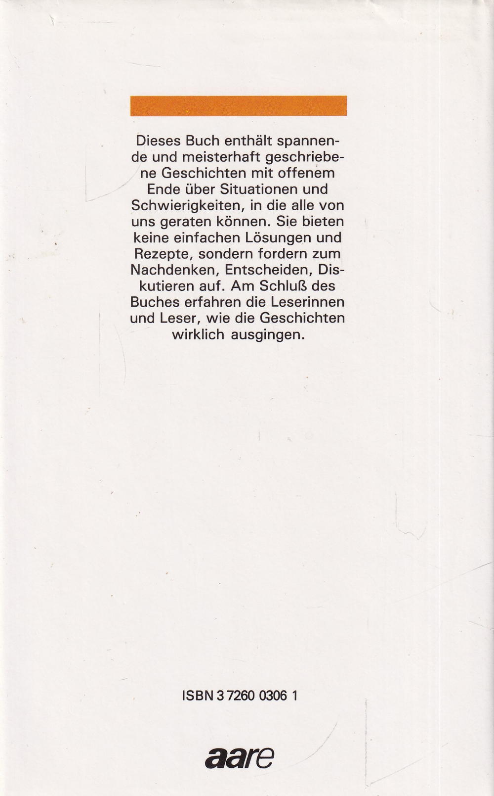 Dieses Buch enthält spannende und meisterhaft geschriebene Geschichten mit offenem Ende über Situationen und Schwierigkeiten, in die alle von uns geraten können. Sie bieten keine einfachen Lösungen und Rezepte, sondern fordern zum Nachdenken, Entscheiden, Diskutieren auf. Am Schluss des Buches erfahren die Leserinnen und Leser, wie die Geschichten wirklich ausgingen.