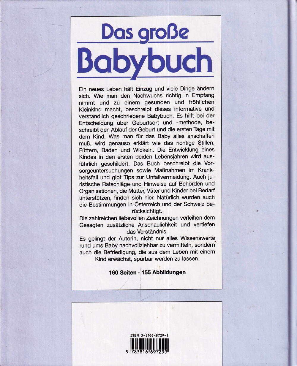 Ein neues Leben hält Einzug und viele Dinge ändern sich. Wie man den Nachwuchs richtig in Empfang nimmt und zu einem gesunden und fröhlichen Kleinkind macht, beschreibt dieses informative und verständlich geschriebene Babybuch. Es hilft bei der Entscheidung über Geburtsort und -methode, beschreibt den Ablauf der Geburt und die ersten Tage mit dem Kind. Was man für das Baby alles anschaffen muss, wird genauso erklärt wie das richtige Stillen, Füttern, Baden und Wickeln. Die Entwicklung eines Kindes in den ersten beiden Lebensjahren wird ausführlich geschildert. Das Buch beschreibt die Vorsorgeuntersuchungen sowie Massnahmen im Krankheitsfall und gibt Tips zur Unfallvermeidung. Auch juristische Ratschläge und Hinweise auf Behörden und Organisationen, die Mütter, Väter und Kinder bei Bedarf unterstützen, finden sich hier. Natürlich wurden auch die Bestimmungen in Österreich und der Schweiz berücksichtigt.