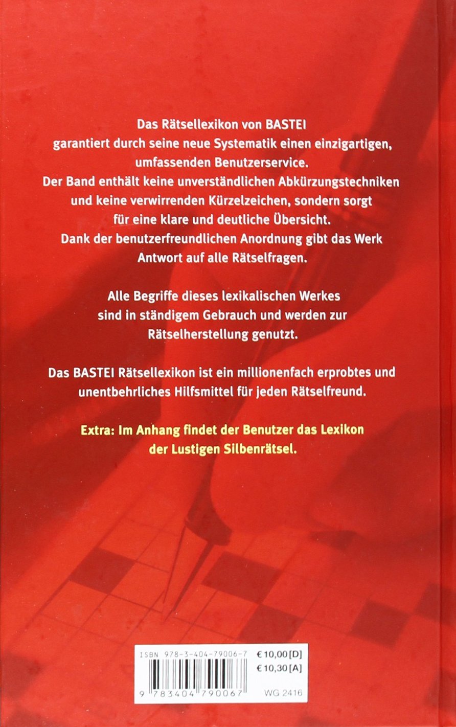 Das Rätsellexikon von BASTEI garantiert durch seine neue Systematik einen einzigartigen, umfassenden Benutzerservice. Der Band enthält keine unverständlichen Abkürzungstechniken und keine verwirrenden Kürzelzeichen, sondern sorgt für eine klare und deutliche Übersicht. Dank der benutzerfreundlichen Anordnung gibt das Werk Antwort auf alle Rästelfragen.