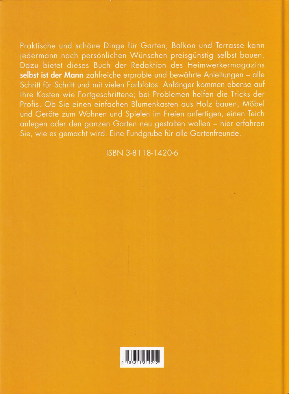 Dazu bietet dieses Buch der Redaktion des Heimwerkermagazins selbst ist der Mann zahlreiche erprobte und bewährte Anleitungen - alle Schritt für Schritt und mit vielen Farbfotos. Anfänger kommen ebenso auf ihre Kosten wie Fortgeschrittene; bei Problemen helfen die Tricks der Profis. Ob Sie einen einfachen Blumenkasten aus Holz bauen, Möbel und Geräte zum Wohnen und Spielen im Freien anfertigen, einen Teich anlegen oder den ganzen Garten neu gestalten wollen - hier erfahren Sie, wie es gemacht wird. Eine Fundgrube für alle Gartenfreunde.