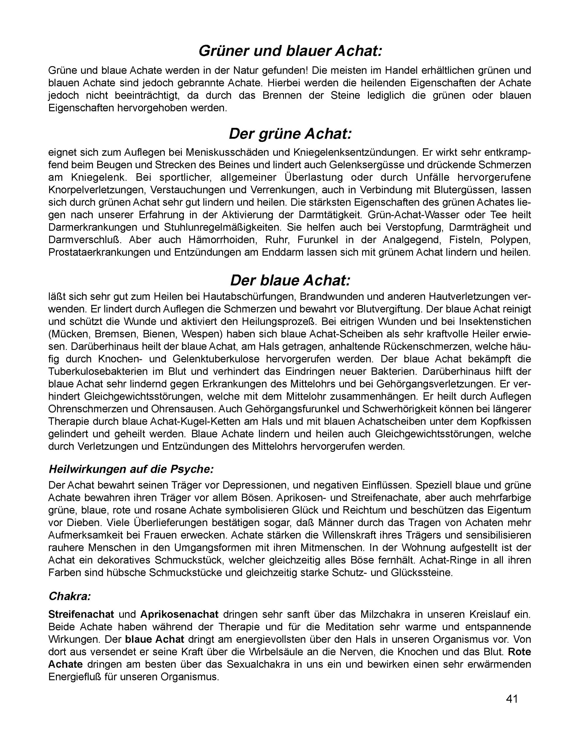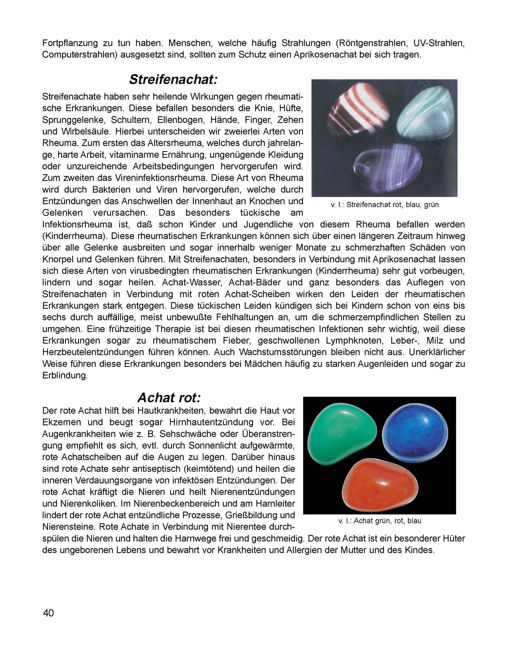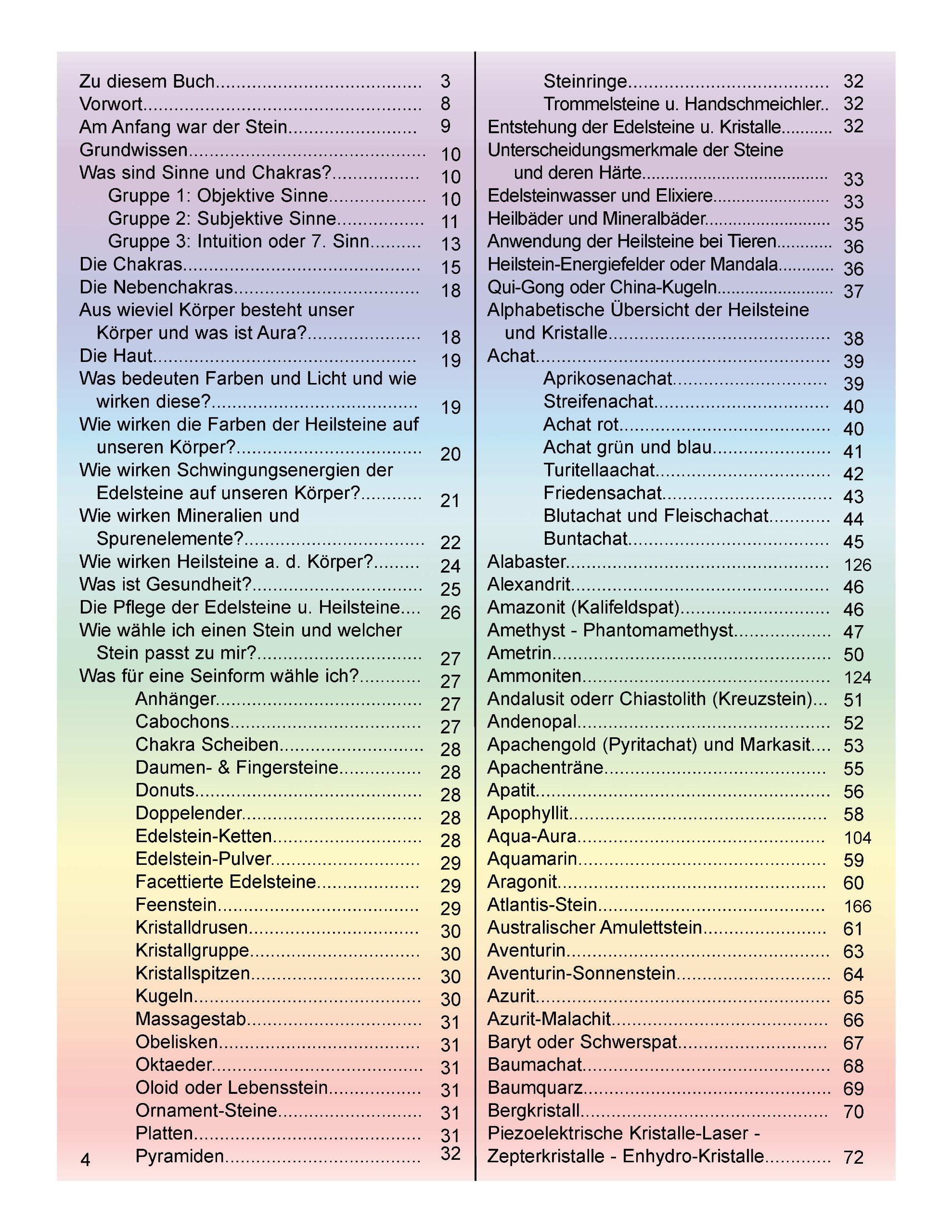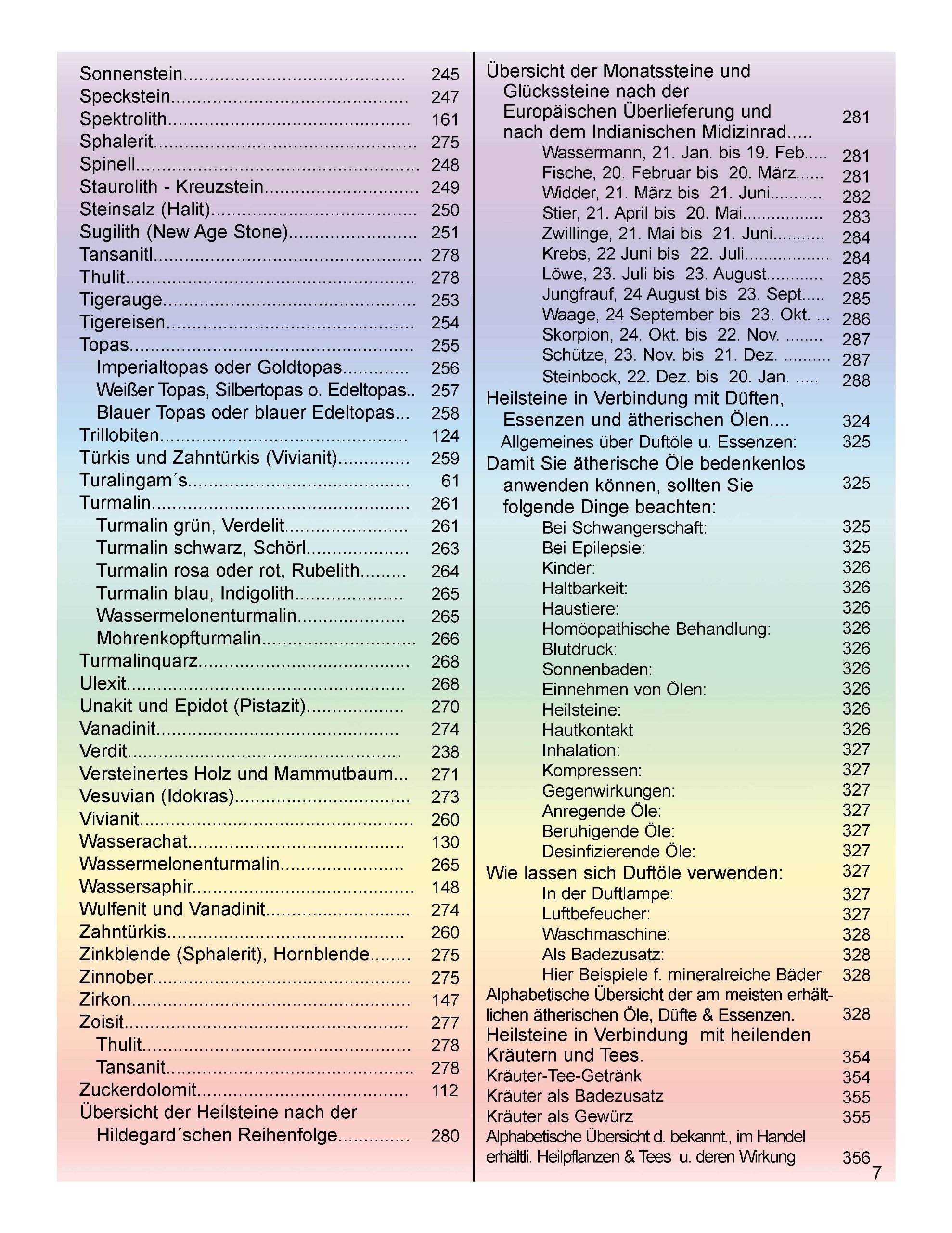 Dieses Buch beschreibt sehr genau und leicht verständlich die Heilmöglichkeiten und Anwendungsgebiete der Heilsteine, Düfte und Kräuter, so dass auch der Anfänger sehr schnell einen umfassenden Einblick in die Steinheilkunde bekommt. Dieses Nachschlagewerk heisst zwar Lexikon; aufgrund seines Aufbaus von A bis Z, hat jedoch mit seinen genauen Beschreibungen Fachbuch-Charakter. Der Autor beschreibt aus jahrzehntelanger Erfahrung die heilenden Kräfte der Edelsteine, Düfte und Kräuter auf den Körper und die Seele. Er lässt dabei hinsichtlich Geologie, geschichtlicher Überlieferung, körperlicher und geistiger Anwendung, Astrologie, Pflege und zur Herstellung von Heilsteinwasser keine Fragen offen. 240 Steine sind farbig abgebildet und genau beschrieben. Darüberhinaus wird Ihnen ein umfangreiches Wissen um die Heilsteine herum vermittelt. Chakras, Aura, Licht und Farben, Mineralien und Spurenelemente runden dieses Nachschlagewerk ab und machen es zu einem unentbehrlichen Helfer für die richtige Anwendung der Naturheilkunde mit Heilsteinen, Düften und Kräutern. Zusätzlich finden Sie in diesem Buch alle Heilsteine nach der Hildegard'schen Reihenfolge und die Monatssteine nach europäischer und indianischer Überlieferung. Die Entstehung der Heilsteine, deren chemische Zusammensetzung und die geschichtliche Überlieferung machen dieses Lexikon auch für den Hobby-Mineralogen zum unentbehrlichen Nachschlagewerk. Alle erhältlichen Heilsteine von A - Z. Zuzüglich 115 Düfte (ätherische Öle) und 84 Kräuter in einem Nachschlagewerk
