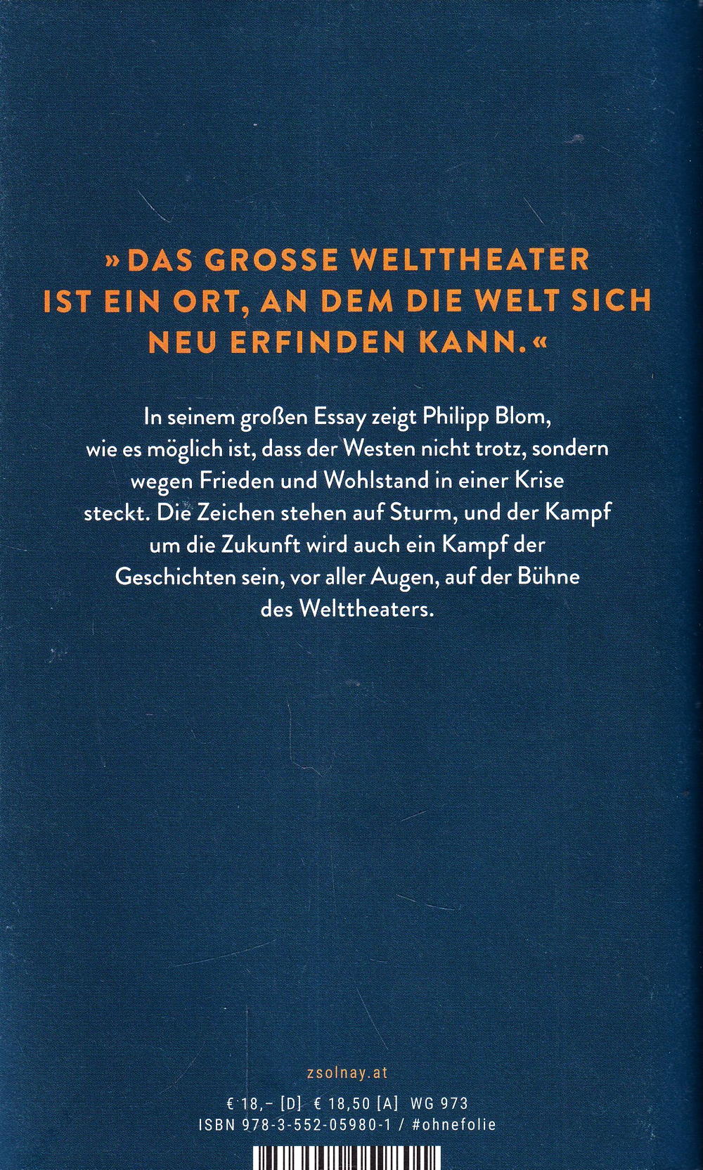 „Das grosse Welttheater ist ein Ort, an dem die Welt sich neu erfinden kann. “ Philipp Bloms Analyse der gegenwärtigen Umbrüche Wir leben in der besten aller Welten: Nie zuvor gab es so lange Frieden bei uns, nie waren wir so reich, so sicher. Diese Geschichten erzählen wir uns selbst. Was aber, wenn sie nicht der Wirklichkeit entsprechen? Wenn die Demokratien bröckeln, der Hass zwischen den sozialen Gruppen wächst, das Wirtschaftswachstum stagniert, die Gefahr einer Klimakatastrophe steigt? In seinem grossen Essay zeigt Philipp Blom, wie es möglich ist, dass der Westen nicht trotz, sondern wegen Frieden und Wohlstand in einer Krise steckt. Nichts in unserer Vergangenheit hat uns darauf vorbereitet. Die Zeichen stehen auf Sturm, und der Kampf um die Zukunft wird auch ein Kampf der Geschichten sein, vor aller Augen, auf der Bühne des Welttheaters.