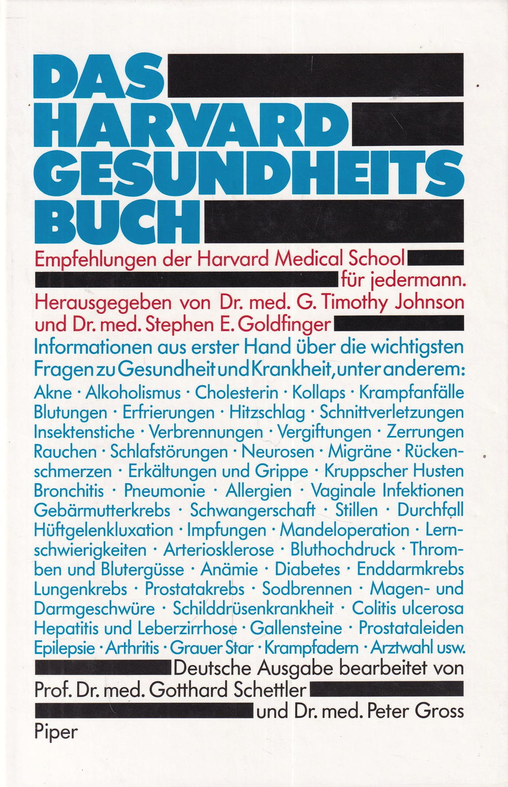 Akne · Alkoholismus · Cholesterin · Kollaps · Krampfanfälle Blutungen · Erfrierungen · Hitzschlag · Schnittverletzungen Insektenstiche · Verbrennungen · Vergiftungen · Zerrungen Rauchen · Schlafstörungen · Neurosen · Migräne · Rückenschmerzen · Erkältungen und Grippe · Kruppscher Husten Bronchitis · Pneumonie · Allergien · Vaginale Infektionen Gebärmutterkrebs · Schwangerschaft · Stillen Durchfall Hüftgelenkluxation · Impfungen Mandeloperation · Lemschwierigkeiten · Arteriosklerose · Bluthochdruck · Thromben und Blutergüsse · Anämie · Diabetes Enddarmkrebs Lungenkrebs · Prostatakrebs · Sodbrennen · Magen- und Darmgeschwüre · Schilddrüsenkrankheit · Colitis ulcerosa Hepatitis und Leberzirrhose · Gallensteine · Prostataleiden Epilepsie Arthritis · Grauer Star Krampfadern Arztwahl usw.