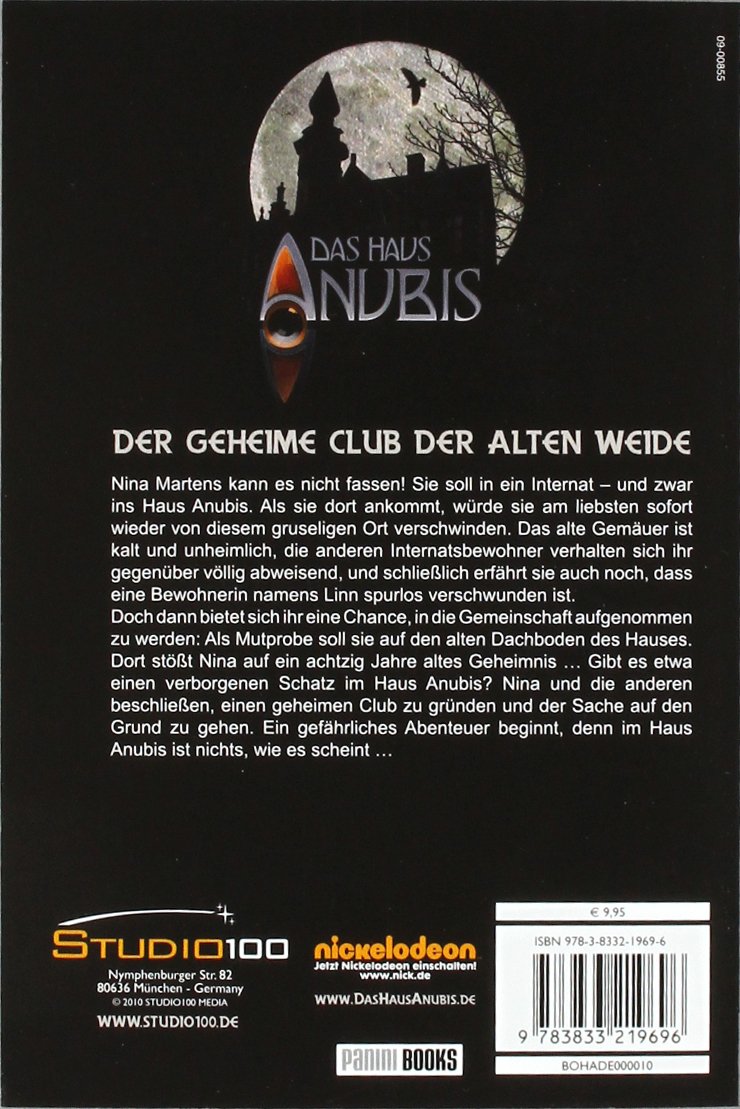 Nina Martens kann es nicht fassen! Sie soll in ein Internat und zwar ins Haus Anubis. Als sie dort ankommt, würde sie am liebsten sofort wieder von diesem gruseligen Ort verschwinden. Das alte Gemäuer ist kalt und unheimlich, die anderen Internatsbewohner verhalten sich ihr gegenüber völlig abweisend, und schliesslich erfährt sie auch noch, dass eine Bewohnerin namens Linn spurlos verschwunden ist. Doch dann bietet sich ihr eine Chance, in die Gemeinschaft aufgenommen zu werden: Als Mutprobe soll sie auf den alten Dachboden des Hauses. Dort stösst Nina auf ein achtzig Jahre altes Geheimnis ... Gibt es etwa einen verborgenen Schatz im Haus Anubis? Nina und die anderen beschliessen, einen geheimen Club zu gründen und der Sache auf den Grund zu gehen. Ein gefährliches Abenteuer beginnt, denn im Haus Anubis ist nichts, wie es scheint.