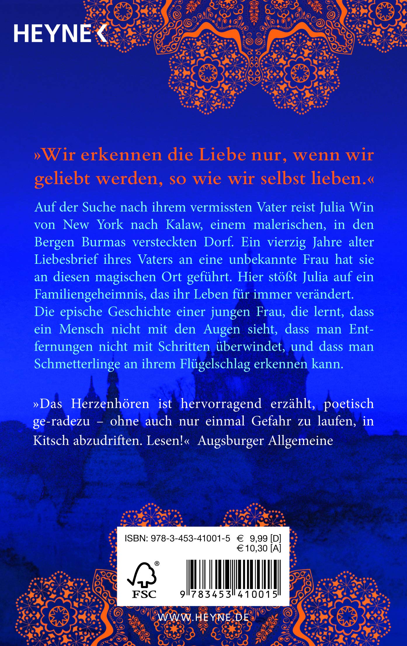 Eine der grossen Liebesgeschichten unserer Zeit, die schon Hunderttausende Leserinnen begeisterte und stetig neue Leser findet: Die Suche nach ihrem vermissten Vater führt Julia Win von New York nach Kalaw, einem malerischen, in den Bergen Burmas versteckten Dorf. Ein vierzig Jahre alter Liebesbrief ihres Vaters an eine unbekannte Frau hat sie an diesen magischen Ort geführt. Hier findet sie nicht nur einen Bruder, von dem sie nichts wusste, sondern stösst auch auf ein Familiengeheimnis, das ihr Leben für immer verändert.