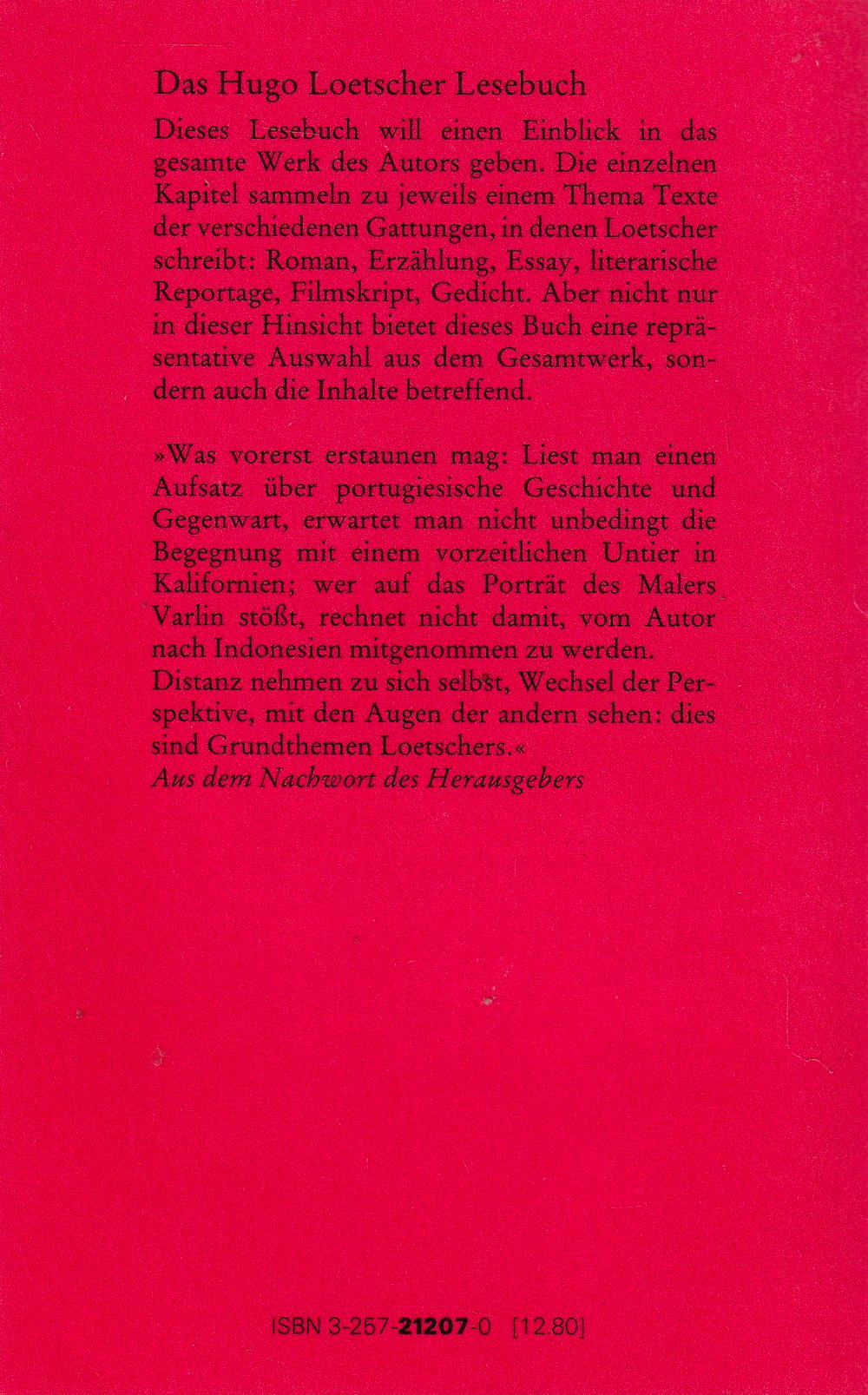 » Was vorerst erstaunen mag: Liest man einen Aufsatz über portugiesische Geschichte und Gegenwart, erwartet man nicht unbedingt die Begegnung mit einem vorzeitlichen Untier in Kalifornien; wer auf das Porträt des Malers Varlin stösst, rechnet nicht damit, vom Autor nach Indonesien mitgenommen zu werden. Distanz nehmen zu sich selbst, Wechsel der Perspektive, mit den Augen der andern sehen: dies sind Grundthemen Loetschers. «