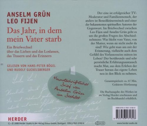 Der eine ist erfolgreicher TV-Moderator und Familienmensch, der andere ist Benediktinermönch und einer der bekanntesten spirituellen Autoren der Gegenwart. Im Briefwechsel zwischen Leo Fijen und Anselm Grün geht es um die grossen Fragen des Abschiednehmens: Was bleibt vom Vater, von der Mutter, wenn sie nicht mehr da sind? Wie geht man um mit der Erinnerung, vielleicht auch dem Gefühl des Verlassenseins mitten im Leben? Der berührende und sehr persönliche Erfahrungsaustausch macht Mut, aus dem Erleben der Trauer heraus das eigene Leben neu in den Blick zu nehmen.