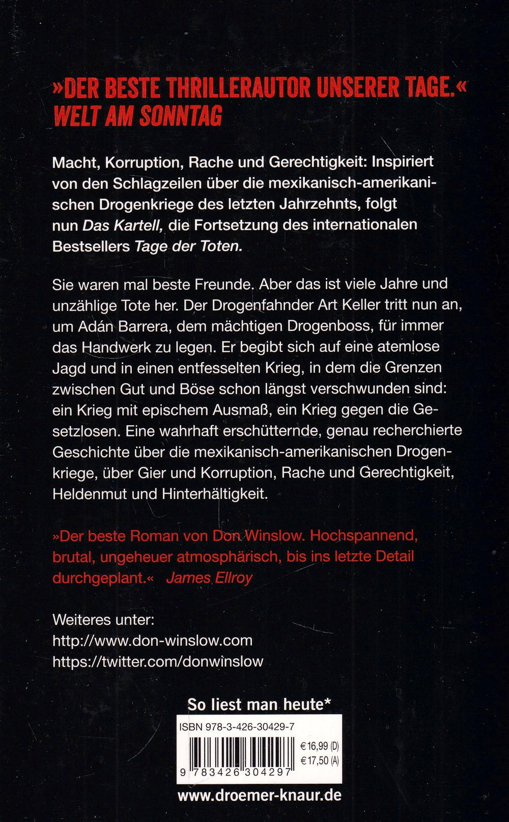 Der Spiegel-Bestseller "Das Kartell", die Fortsetzung des internationalen Bestsellers "Tage der Toten" des Thriller-Autors Don Winslow, ist ein monumentales Epos über den mexikanisch-amerikanischen Drogenkrieg. Es ist das Jahr 2004: Sie waren mal beste Freunde. Aber das ist viele Jahre und unzählige Auftragsmorde her. Der Drogenfahnder Art Keller tritt nun an, um Adán Barrera, dem mächtigen Drogenboss in Mexiko, für immer das Handwerk zu legen. Er begibt sich auf eine atemlose Jagd und in einen entfesselten Krieg zwischen CIA, DEA und Narcos, in dem die Grenzen zwischen Gut und Böse schon längst verschwunden sind. Eine wahrhaft erschütternde, genau recherchierte Geschichte über die mexikanisch-amerikanischen Drogenkriege, über Gier und Korruption, Rache und Gerechtigkeit, Heldenmut und Hinterhältigkeit. "Der beste Roman von Don Winslow. Hochspannend, brutal, ungeheuer atmosphärisch, bis ins letzte Detail durchgeplant." James Ellroy