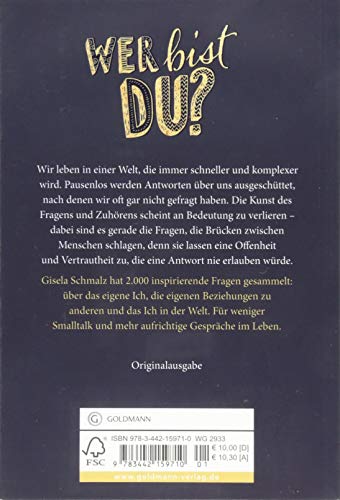 Wir leben in einer Welt, die immer schneller und komplexer wird. Pausenlos werden Antworten über uns ausgeschüttet, nach denen wir oft gar nicht gefragt haben. Die Kunst des Fragens und Zuhörens scheint an Bedeutung zu verlieren – dabei sind es gerade die Fragen, die Brücken zwischen Menschen schlagen. Fragen lassen eine Offenheit und Vertrautheit zu, die eine Antwort nie erlauben würde. Was ist dein dunkelstes Geheimnis? Was ist dein hellstes Geheimnis? Wann bist du zu dir selbst ehrlich und wann nicht? Mit wem würdest du gerne eine Nacht verbringen, dann aber goodbye sagen? Gisela Schmalz hat 2.000 inspirierende Fragen gesammelt: über uns selbst, über unsere Beziehungen zu anderen und über uns in der Welt. Wie geht es dir heute wirklich? Für weniger Smalltalk und mehr aufrichtige Gespräche in unserem Leben!