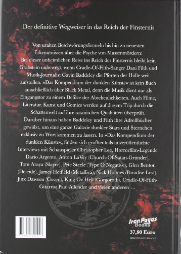 Von uralten Beschwörungsformeln bis hin zu neuesten Erkenntnissen über die Psyche von Massenmördern: Bei dieser unheimlichen Reise ins Reich der Finsternis bleibt kein Grabstein unbewegt, wenn Cradle-Of-Filth-Sänger Dani Filth und Musik-Journalist Gavin Baddeley die Pforten der Hölle weit aufstossen. 'Das Kompendium der dunklen Künste' ist kein Buch ausschliesslich über Black Metal, denn die Musik dient nur als Eingangstor zu einem Defilee der Abscheulichkeiten. Auch Filme, Literatur, Kunst und Comics werden auf diesem Trip durch die Schattenwelt auf ihre satanischen Qualitäten überprüft. Darüber hinaus haben Baddeley und Filth ihre Adressbücher gewälzt, um eine ganze Galaxie dunkler Stars und Sternchen exklusiv zu Wort kommen zu lassen. In 'Das Kompendium der dunklen Künste', finden sich grösstenteils unveröffentlichte Interviews mit Schauspieler Christopher Lee, Horrorfilm-Legende Dario Argento, Anton LaVey (Church-Of-Satan-Gründer), Tom Araya (Slayer), Pete Steele (Type O Negative), Glen Benton (Deicide), James Hetfield (Metallica), Nick Holmes (Paradise Lost), Jinx Dawson (Coven), King Of Hell (Gorgoroth), Cradle-Of-Filth-Gitarrist Paul Allender und vielen anderen …