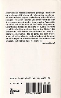 "Das Wort Tao hat seit jeher eine gewaltige Faszination auf mich ausgeübt, obwohl ich - abgesehen von der damit verbundenen großartigen Dichtung, seiner Bibel sozusagen von den Taoisten und ihren verschiedenen Anschauungen wenig wußte. Aber von dem Augenblick an, als ich zum ersten Male auf das Tao Te King, jenes an Schönheit und Präzision so reiche Werk, stieß, das eine verschlüsselte Beschreibung des großen, Motors' des Universums und seiner Mechan ismen ist, hatte ich irgendwie das Gefühl, daß es genau das sein mußte, woran ich selbst glaubte - oder glauben würde, wenn ich eines Tages auf die Idee kommen sollte, daß Glaube etwas absolut Notwendiges für mich sei. "