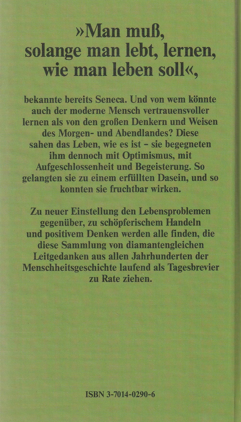 Zu neuer Einstellung den Lebensproblemen gegenüber, und positivem Denken werden alle finden, die diese Sammlung von diamantengleichen Leitgedanken aus allen Jahrhunderten der Menschheitsgeschichte laufend als Tagesbrevier schöpferischem Handeln zu zu Rate ziehen.