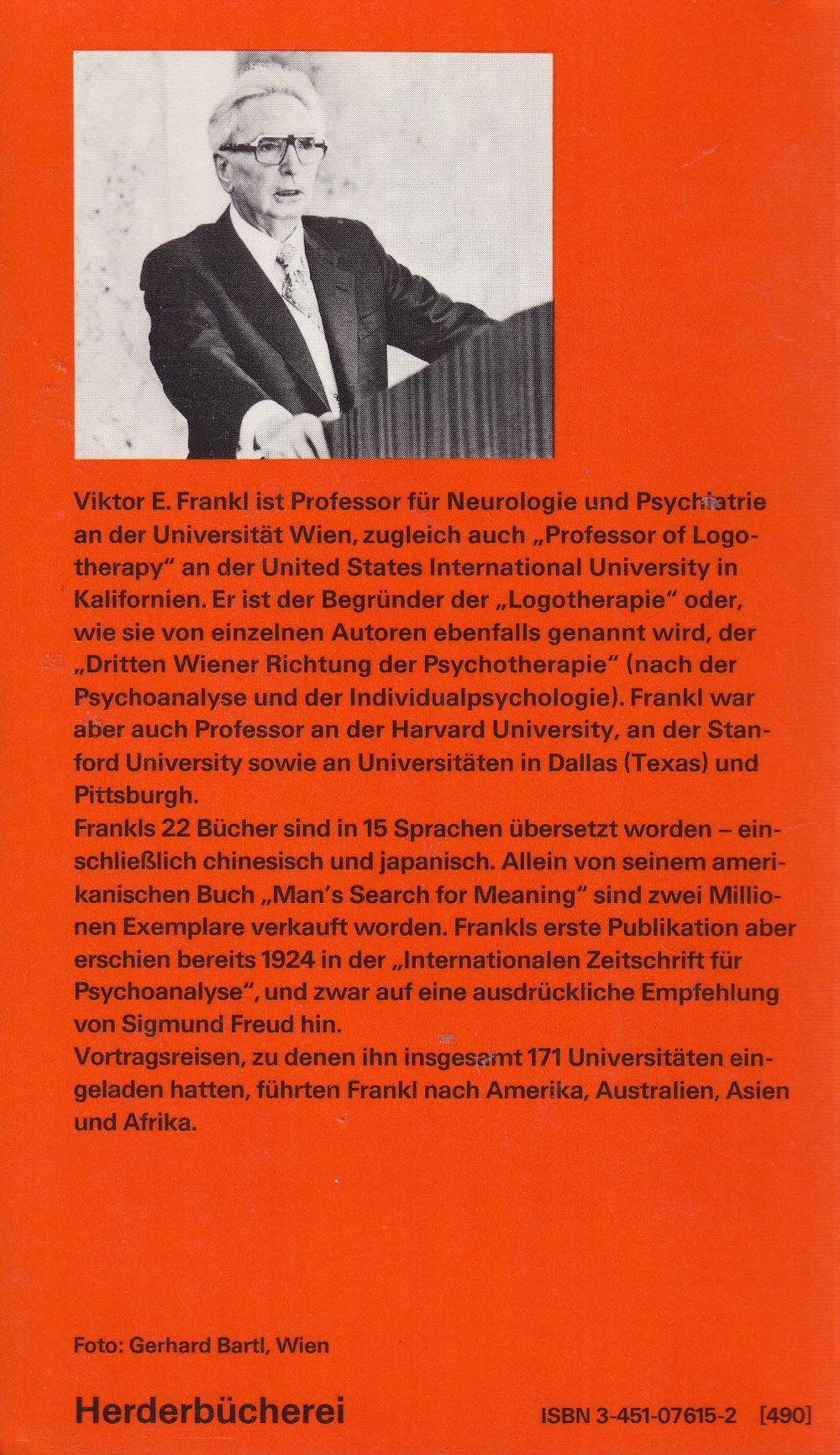 Viktor E. Frankl ist Professor für Neurologie und Psychiatrie an der Universität Wien, zugleich auch „Professor of Logotherapy" an der United States International University in Kalifornien. Er ist der Begründer der, Logotherapie" oder, wie sie von einzelnen Autoren ebenfalls genannt wird, der „Dritten Wiener Richtung der Psychotherapie" (nach der Psychoanalyse und der Individualpsychologie). Frankl war aber auch Professor an der Harvard University, an der Stanford University sowie an Universitäten in Dallas (Texas) und Pittsburgh. Frankls 22 Bücher sind in 15 Sprachen übersetzt worden - einschliesslich chinesisch und japanisch. Allein von seinem amerikanischen Buch,, Man's Search for Meaning" sind zwei Millionen Exemplare verkauft worden. Frankls erste Publikation aber erschien bereits 1924 in der, Internationalen Zeitschrift für Psychoanalyse", und zwar auf eine ausdrückliche Empfehlung von Sigmund Freud hin. Vortragsreisen, zu denen ihn insgesamt 171 Universitäten eingeladen hatten, führten Frankl nach Amerika, Australien, Asien und Afrika.