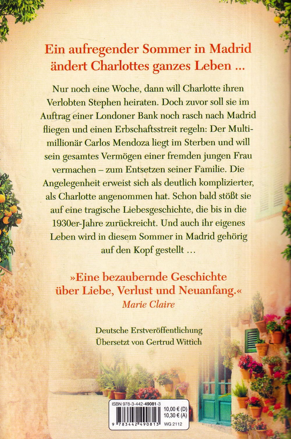 Nur noch eine Woche, dann will Charlotte Fairfax ihren Verlobten Stephen heiraten. Doch zuvor soll sie im Auftrag einer Londoner Bank noch rasch nach Madrid fliegen und einen Erbschaftsstreit regeln: Der Multimillionär Carlos Mendoza liegt im Sterben und will sein gesamtes Vermögen einer fremden jungen Frau vermachen - zum Entsetzen seiner Familie. Die Angelegenheit erweist sich als deutlich komplizierter, als Charlotte angenommen hat. Schon bald stösst sie auf eine tragische Liebesgeschichte, die bis in die 1930er-Jahre zurückreicht. Und auch ihr eigenes Leben wird in diesem Sommer in Madrid gehörig auf den Kopf gestellt ...