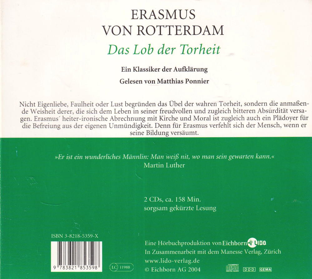In diesem Meisterstück vorurteilsfreien Denkens erweckte Erasmus von Rotterdam die ironische Lobrede zu neuem Leben. Mit unübertroffener Leichtigkeit und rhetorischer Eleganz, rhythmischem Zauber und einzigartiger Musikalität zielt seine Rede nicht auf eine bestimmte Person, sondern auf alle denkbaren Dummheiten und Laster. "Das Lob der Torheit" ist ein unterhaltsames Buch, das in seiner scharfsinnigen Überzeichnung zum Lachen reizt. Die philosophische Tiefe des Buches besteht darin, dass die Torheit - ob als Forscherdrang oder Spielleidenschaft, Aberglaube oder Adelsstolz, Sophismus oder Eitelkeit - nicht nur als verdammenswertes Laster gesehen wird, sondern auch als notwendige Illusion, damit das Dasein überhaup t erträglich wird. Weisheit bedeutet demnach für Erasmus Erkenntnis der eigenen Beschränktheit und gelassenes Sich-Abfinden mit dem illusionären Charakter des Lebens: Torheit ist die wahre Weisheit, eingebildete Weisheit ist Torheit.