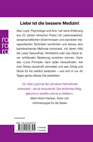 Liebe ist die bessere Medizin! Alex Loyd, Psychologe und Arzt, hat seine Erfahrung aus 25 Jahren klinischer Praxis mit Lebensweisheit, wissenschaftlichen Erkenntnissen und erprobten therapeutischen Techniken kombiniert und daraus eine bahnbrechende Methode entwickelt, mit deren Hilfe die Leser Gesundheit, Wohlstand oder das Glück einer erfüllenden Beziehung erreichen können. Loyd ist überzeugt: Die Liebe ist das stärkste Heilmittel gegen Krankheiten und die einzig wahre Grundlage für eine glückliche Lebensveränderung. Dank des «Love Principle» kann jeder, der diese Anleitung zum Lieben richtig anwendet, herausfinden, wie man Stress dauerhaft vermeidet und was Erfolg und Glück für ihn wirklich bedeuten – und sich in nur 40 Tagen genau dieses persönliche Ziel erarbeiten.