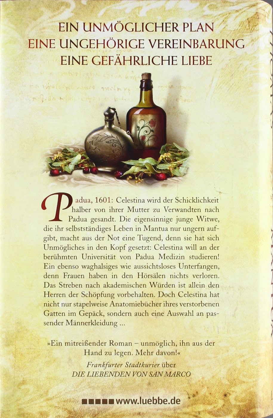 Padua, 1601. Celestina wird der Schicklichkeit halber von ihrer Mutter zu Verwandten nach Padua gesandt. Die eigensinnige junge Witwe, die ihr selbstständiges Leben in Mantua nur ungern aufgibt, macht aus der Not eine Tugend, denn sie hat sich Unmögliches in den Kopf gesetzt: Celestina will an der berühmten Universität von Padua Medizin studieren! Ein ebenso waghalsiges wie aussichtsloses Unterfangen, denn Frauen haben in den Hörsälen nichts verloren. Das Streben nach akademischen Würden ist allein den Herren der Schöpfung vorbehalten. Doch Celestina hat nicht nur stapelweise Anatomiebücher ihres verstorbenen Gatten im Gepäck, sondern auch eine Auswahl an passender Männerkleidung.