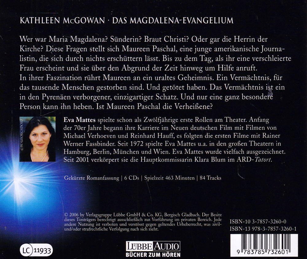 Wer war Maria Magdalena? Sünderin? Braut Christi? Oder gar die Herrin der Kirche? Diese Fragen stellt sich Maureen Paschal, eine junge amerikanische Journalistin, die sich durch nichts erschüttern lässt. Bis zu dem Tag, als ihr einen verschleierte Frau erscheint und sie über den Abgrund der Zeit hinweg um Hilfe anruft. In ihrer Faszination rührt Maureen an ein uraltes Geheimnis. Ein Vermächtnis, für das tausende Menschen gestorben sind. Und getötet haben. Das Vermächtnis ist ein in den Pyrenäen verborgener, einzigartiger Schatz. Und nur eine ganz besondere Person kann ihn heben. Ist Maureen Paschal die Verheissene?