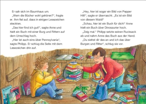 Die Geschwister Anne und Philipp reisen mit dem magischen Baumhaus durch die Zeit, entdecken ferne Länder und erleben spannende Abenteuer. Mit vielen bunten Bildern, besonders für Kinder ab 6 Jahren geeignet. Ein Baumhaus mitten im Wald, wie aufregend! Neugierig klettern Anne und Philipp die Strickleiter hinauf. Wem es wohl gehört? Doch plötzlich beginnt das Baumhaus, sich wild zu drehen. Immer schneller und schneller. Als die Kinder aus dem Fenster sehen, trauen sie ihren Augen kaum: Sie sind durch die Zeit gereist – und mitten im Tal der Dinosaurier gelandet! Basierend auf der Originalausgabe „Im Tal der Dinosaurier“. Gekürzt und zum Vorlesen bearbeitet, mit vielen farbigen Illustrationen.