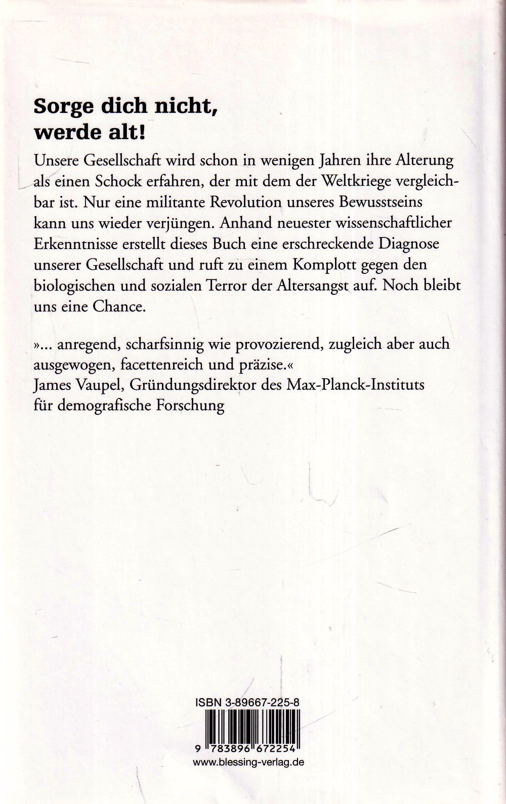 Unsere Gesellschaft wird schon in wenigen Jahren ihre Alterung als einen Schock erfahren, der mit dem der Weltkriege vergleichbar ist. Nur eine militante Revolution unseres Bewusstseins kann uns wieder verjüngen. Anhand neuester wissenschaftlicher Erkenntnisse erstellt dieses Buch eine erschreckende Diagnose unserer Gesellschaft und ruft zu einem Komplott gegen den biologischen und sozialen Terror der Altersangst auf. Noch bleibt uns eine Chance.