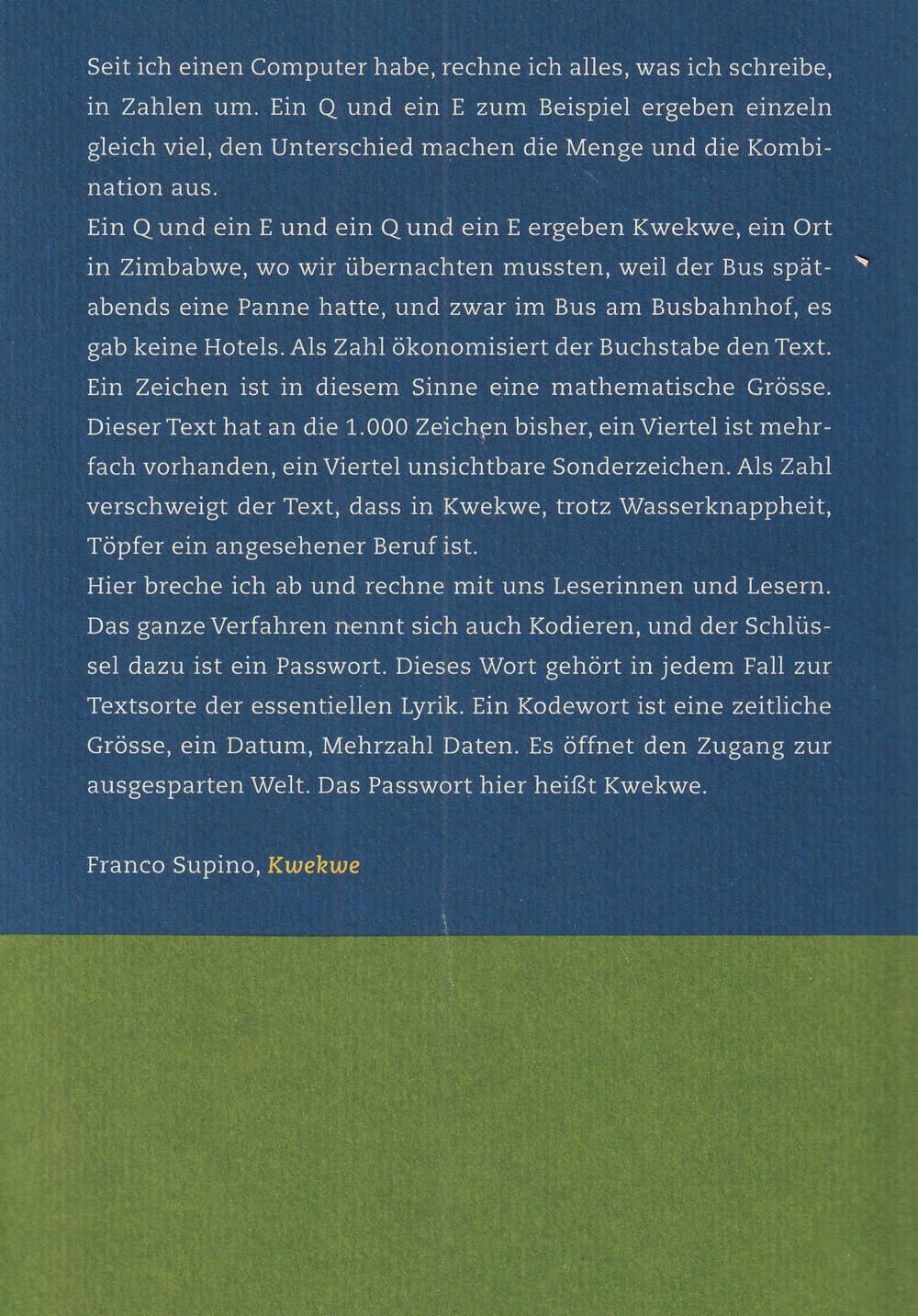 Hier breche ich ab und rechne mit uns Leserinnen und Lesern. Das ganze Verfahren nennt sich auch Kodieren, und der Schlüssel dazu ist ein Passwort. Dieses Wort gehört in jedem Fall zur Textsorte der essentiellen Lyrik. Ein Kodewort ist eine zeitliche Grösse, ein Datum, Mehrzahl Daten. Es öffnet den Zugang zur ausgesparten Welt. Das Passwort hier heisst Kwekwe.
