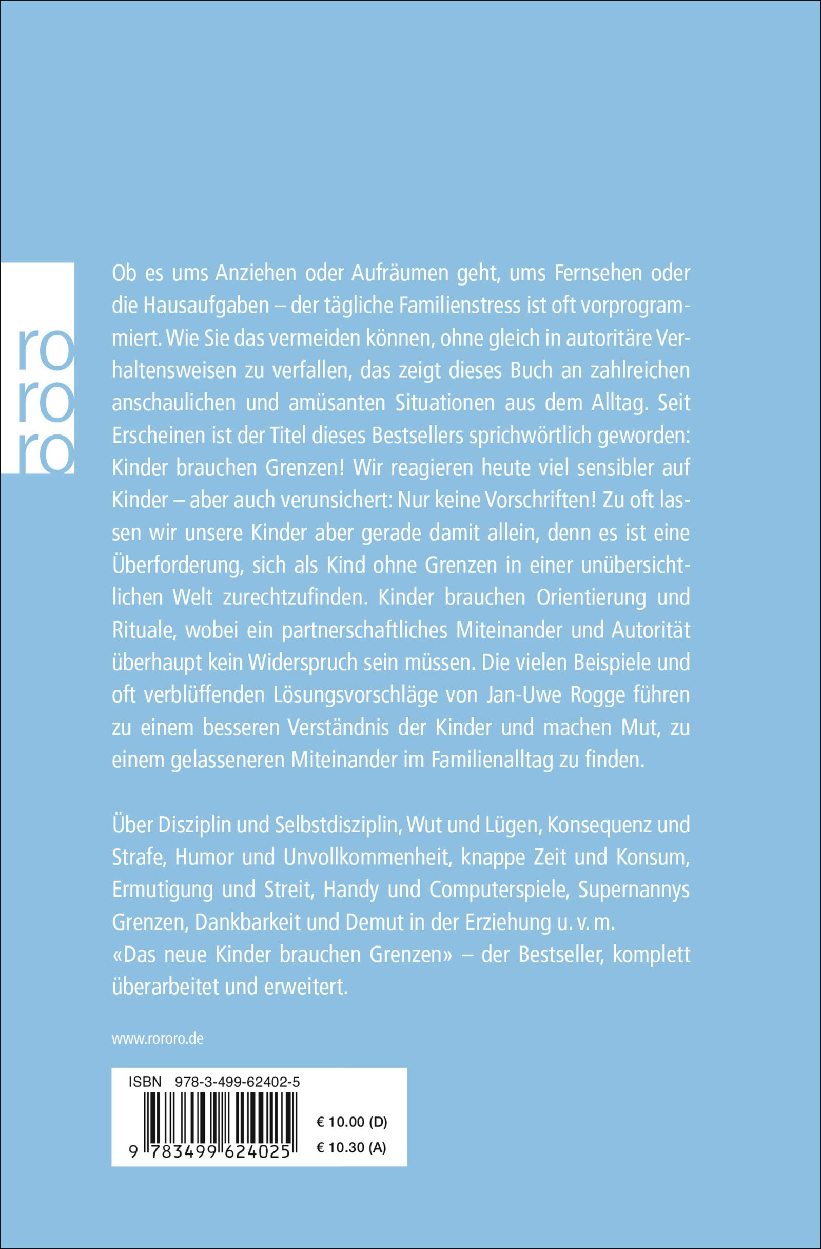 Vor 12 Jahren erschien "Kinder brauchen Grenzen" erstmals: Seitdem haben sich die Bedingungen des Eltern- und Kindseins entscheidend geändert: Der Einfluss der Medien ist grösser geworden, die traditionelle Rollenverteilung wird aufgeweicht, die Patchworkfamilie ist für viele Kinder und Eltern Realität. Diesen Veränderungen trägt Jan-Uwe Rogge Rechnung, indem er seinen pädagogischen Bestseller um aktuelle Beispiele aus der heutigen Lebenswelt von Familien ergänzt, eine zeitgemässe Ansprache findet und durch eine stärkere Didaktisierung einen noch grösseren Nutzwert für den Leser schafft.