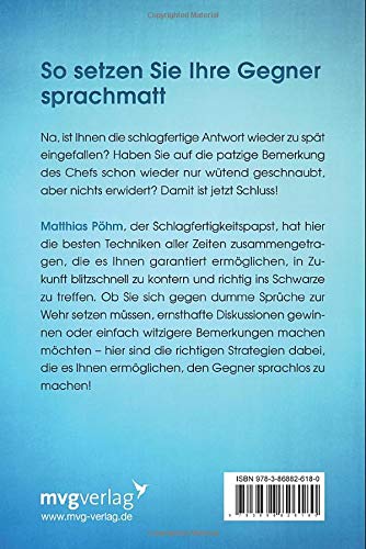 So setzt man seine Gegner sprachmatt! Matthias Pöhm, der ”Schlagfertigkeitspapst”, hat hier die besten Techniken aller Zeiten zusammengetragen, die es garantiert ermöglichen, in Zukunft blitzschnell zu kontern und richtig ins Schwarze zu treffen. Ob man sich gegen dumme Sprüche zur Wehr setzen muss, ernsthafte Diskussionen gewinnen oder einfach witzigere Bemerkungen machen möchte – hier sind für jeden die richtigen Strategien dabei, um den Gegner sprachlos zu machen!