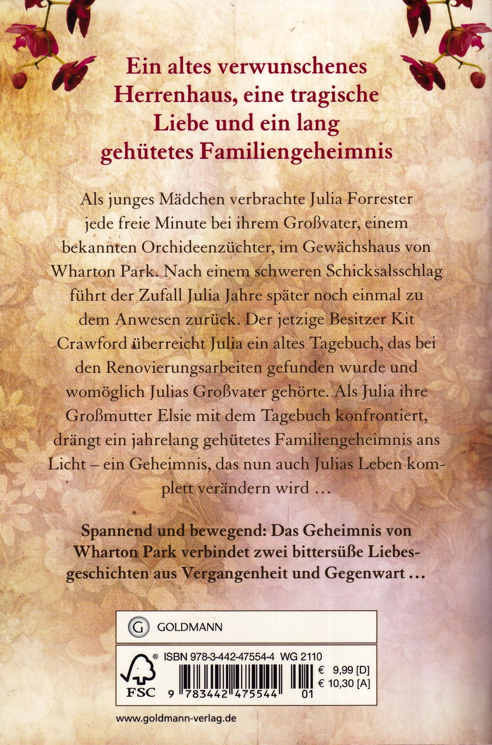 Und jede Liebe ihren Preis Als junges Mädchen verbrachte Julia Forrester jede freie Minute bei ihrem Grossvater, einem bekannten Orchideenzüchter, im Gewächshaus von Wharton Park. Nach einem schweren Schicksalsschlag führt der Zufall Julia Jahre später noch einmal zu dem Anwesen zurück. Der jetzige Besitzer Kit Crawford überreicht ihr ein altes Tagebuch, das bei den Renovierungsarbeiten gefunden wurde und womöglich Julias Grossvater gehörte. Als Julia ihre Grossmutter Elsie mit dem Tagebuch konfrontiert, drängt ein jahrelang gehütetes Familiengeheimnis ans Licht, das auch Julias Leben komplett verändern wird ...