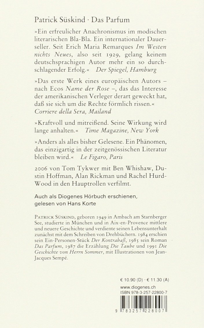 "Von Jean-Baptiste Grenouille, dem finsteren Helden, sei nur verraten, dass er 1738 in Paris, in einer stinkigen Fischbude, geboren wird. Die Ammen, denen das Kerlchen an die Brust gelegt wird, halten es nur ein paar Tage mit ihm aus: Er sei zu gierig, ausserdem vom Teufel besessen, wofür es untrügliche Indizien gebe: den fehlenden Duft, den unverwechselbaren Geruch, den Säuglinge auszuströmen pflegen."
