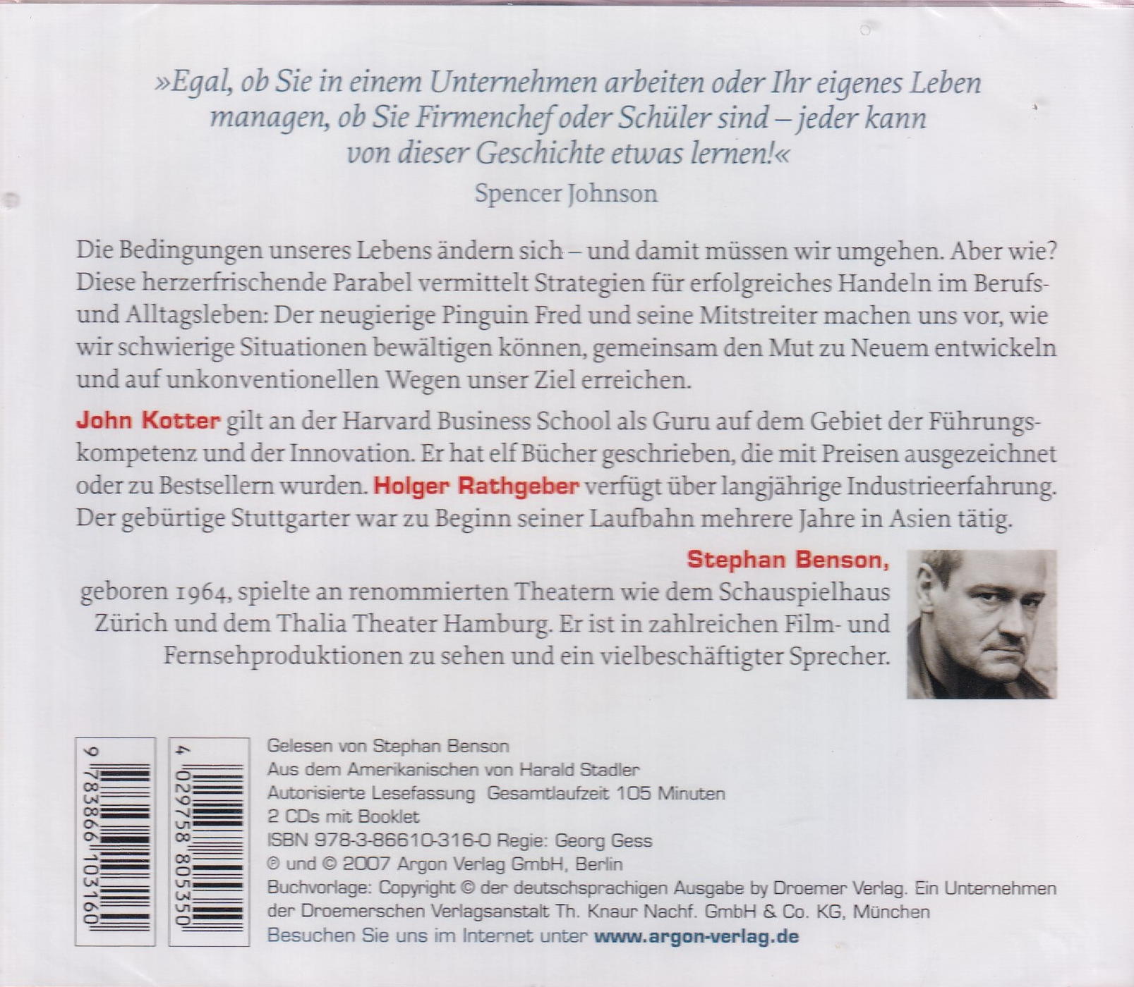 Die Bedingungen unseres Lebens ändern sich – und damit müssen wir umgehen. Aber wie? Diese herzerfrischende Parabel vermittelt Strategien für erfolgreiches Handeln im Berufsund Alltagsleben: Der neugierige Pinguin Fred und seine Mitstreiter machen uns vor, wie wir schwierige Situationen bewältigen können, gemeinsam den Mut zu Neuem entwickeln und auf unkonventionellen Wegen unser Ziel erreichen.