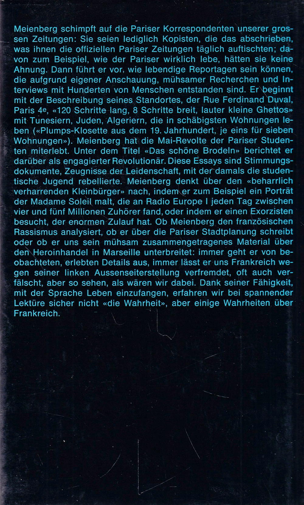 mit Tunesiern, Juden, Algeriern, die in schäbigsten Wohnungen leben («Plumps-Klosette aus dem 19. Jahrhundert, je eins für sieben Wohnungen»). Meienberg hat die Mai-Revolte der Pariser Studenten miterlebt. Unter dem Titel «Das schöne Brodeln» berichtet er darüber als engagierter Revolutionär. Diese Essays sind Stimmungsdokumente, Zeugnisse der Leidenschaft, mit der damals die studentische Jugend rebellierte. Meienberg denkt über den «beharrlich verharrenden Kleinbürger» nach, indem er zum Beispiel ein Porträt der Madame Soleil malt, die an Radio Europe I jeden Tag zwischen vier und fünf Millionen Zuhörer fand, oder indem er einen Exorzisten besucht, der enormen Zulauf hat. Ob Meienberg den französischen Rassismus analysiert, ob er über die Pariser Stadtplanung schreibt oder ob er uns sein mühsam zusammengetragenes Material über den Heroinhandel in Marseille unterbreitet: immer geht er von beobachteten, erlebten Details aus, immer lässt er uns Frankreich wegen seiner linken Aussenseiterstellung verfremdet, oft auch verfälscht, aber so sehen, als wären wir dabei. Dank seiner Fähigkeit, mit der Sprache Leben einzufangen, erfahren wir bei spannender Lektüre sicher nicht «die Wahrheit», aber einige Wahrheiten, über Frankreich.