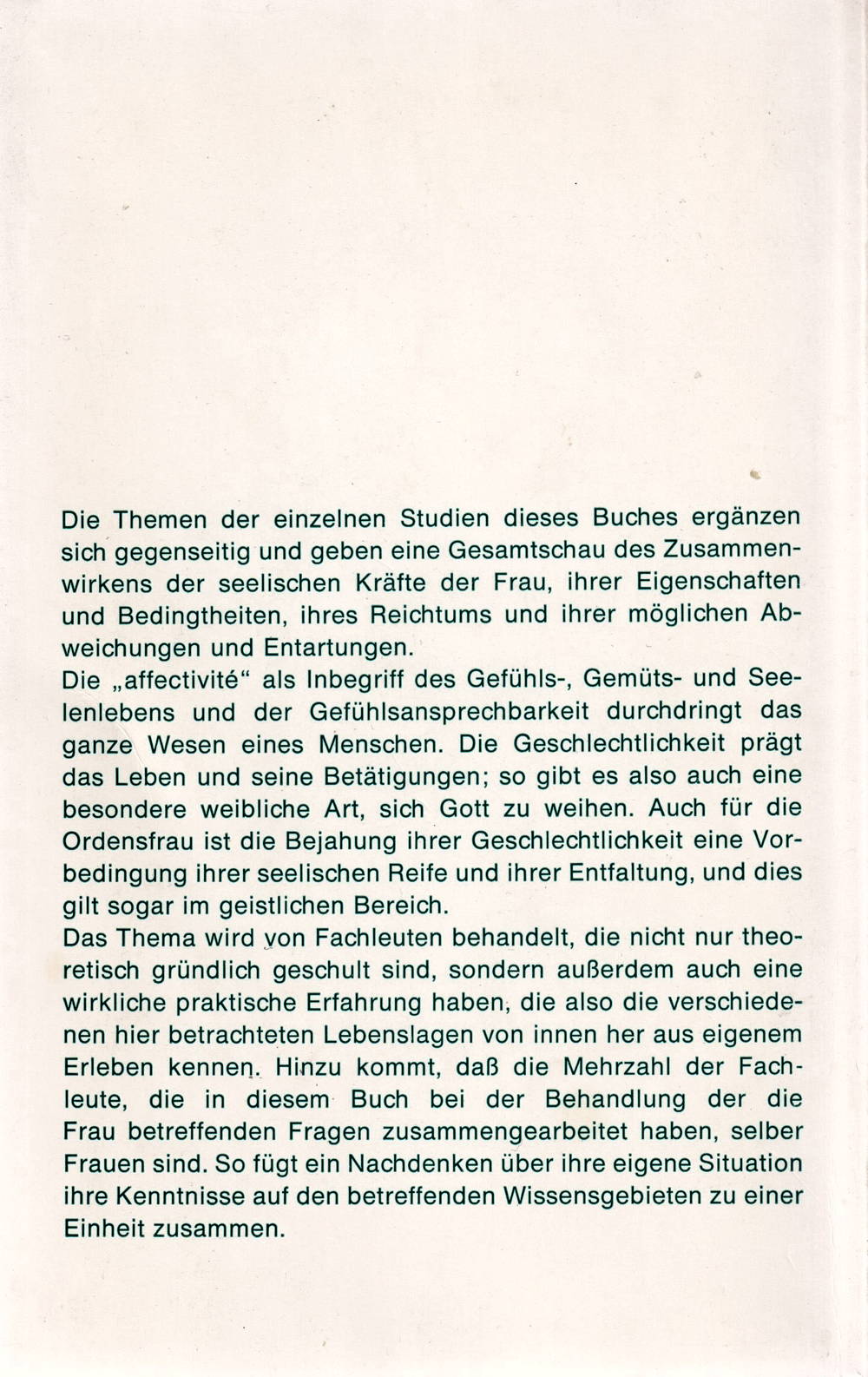Die Themen der einzelnen Studien dieses Buches ergänzen sich gegenseitig und geben eine Gesamtschau des Zusammenwirkens der seelischen Kräfte der Frau, ihrer Eigenschaften und Bedingtheiten, ihres Reichtums und ihrer möglichen Abweichungen und Entartungen. Die,, affectivité" als Inbegriff des Gefühls-, Gemüts- und Seelenlebens und der Gefühlsansprechbarkeit durchdringt das ganze Wesen eines Menschen. Die Gesch lechtlich keit prägt das Leben und seine Betätigungen; so gibt es also auch eine besondere weibliche Art, sich Gott zu weihen. Auch für die Ordensfrau ist die Bejahung ihrer Geschlechtlich keit eine Vorbedingung ihrer seelischen Reife und ihrer Entfaltung, und dies gilt sogar im geistlichen Bereich.