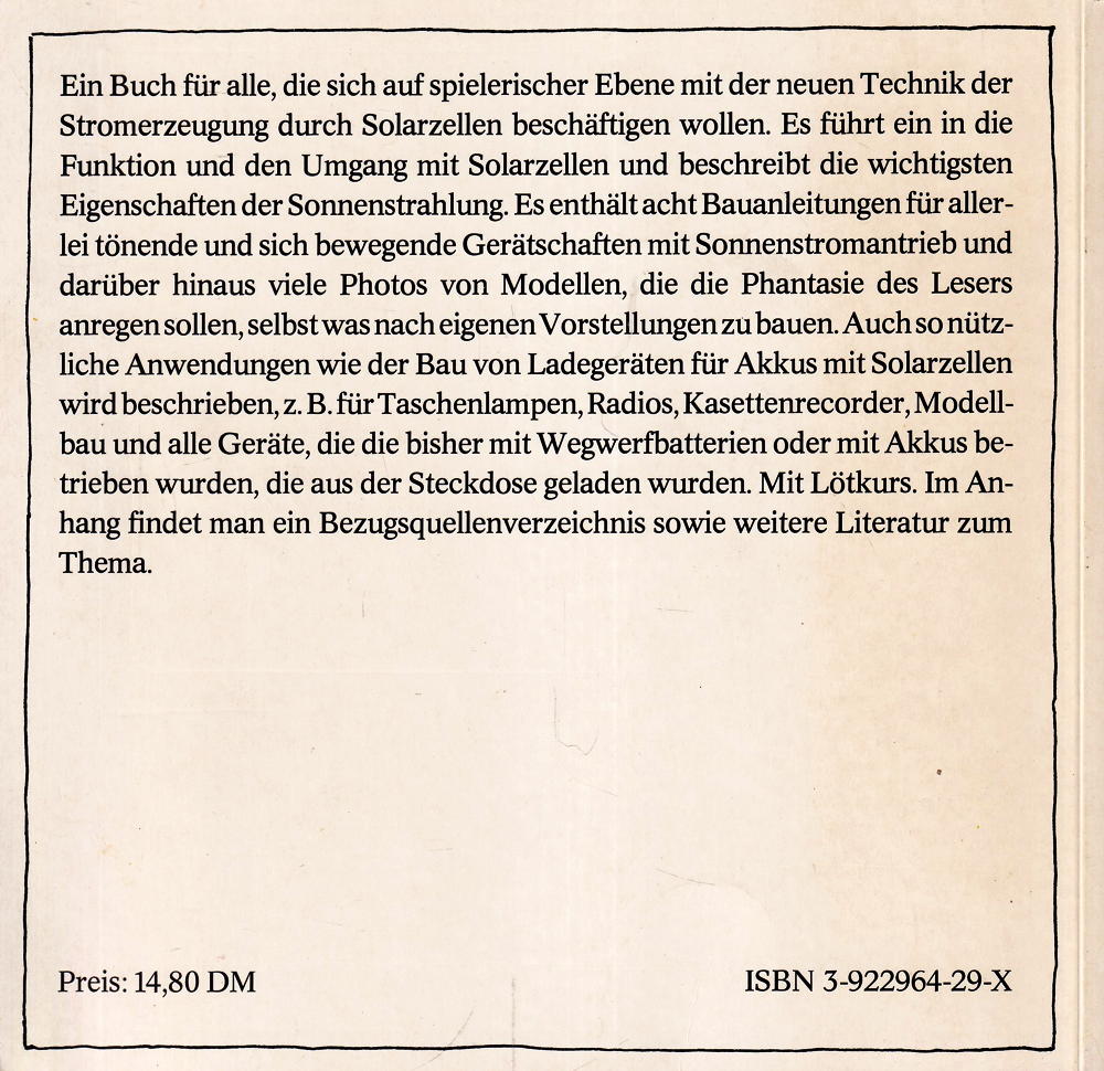 Ein Buch für alle, die sich auf spielerischer Ebene mit der neuen Technik der Stromerzeugung durch Solarzellen beschäftigen wollen. Es führt ein in die Funktion und den Umgang mit Solarzellen und beschreibt die wichtigsten Eigenschaften der Sonnenstrahlung. Es enthält acht Bauanleitungen für allerlei tönende und sich bewegende Gerätschaften mit Sonnenstromantrieb und darüber hinaus viele Photos von Modellen, die die Phantasie des Lesers anregen sollen, selbst was nach eigenen Vorstellungen zu bauen. Auch sonützliche Anwendungen wie der Bau von Ladegeräten für Akkus mit Solarzellen wird beschrieben, z. B. Für Taschenlampen, Radios, Kasettenrecorder, Modellbau und alle Geräte, die die bisher mit Wegwerfbatterien oder mit Akkus betrieben wurden, die aus der Steckdose geladen wurden. Mit Lötkurs. Im Anhang findet man ein Bezugsquellenverzeichnis sowie weitere Literatur zum Thema.