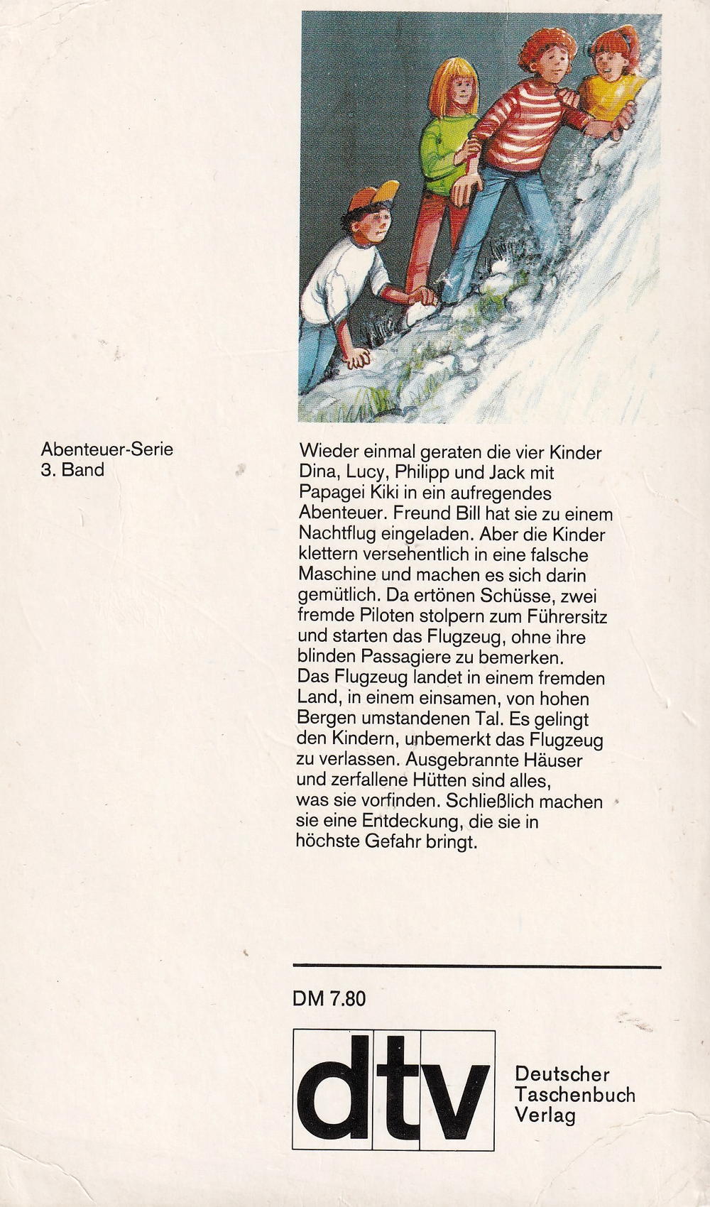 Wieder einmal geraten die vier Kinder Dina, Lucy, Philipp und Jack mit Papagei Kiki in ein aufregendes Abenteuer. Freund Bill hat sie zu einem Nachtflug eingeladen. Aber die Kinder klettern versehentlich in eine falsche Maschine und machen es sich darin gemütlich. Da ertönen Schüsse, zwei fremde Piloten stolpern zum Führersitz und starten das Flugzeug, ohne ihre blinden Passagiere zu bemerken.