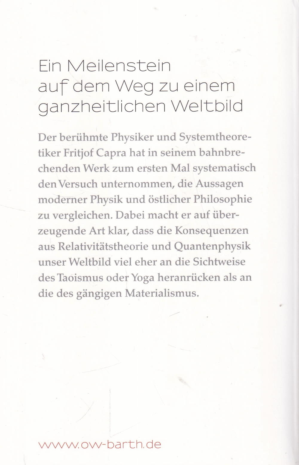 Der berühmte Physiker und Systemtheoretiker Fritjof Capra hat in seinem bahnbrechenden Werk zum ersten Mal systematisch den Versuch unternommen, die Aussagen moderner Physik und östlicher Philosophie zu vergleichen. Dabei macht er auf überzeugende Art klar, dass die Konsequenzen aus Relativitätstheorie und Quantenphysik unser Weltbild viel eher an die Sichtweise des Taoismus oder Yoga heranrücken als an die des gängigen Materialismus.