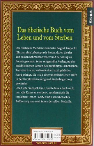 Der tibetische Meditationsmeister Sogyal Rinpoche führt an eine Lebenspraxis heran, die den Tod als Teil des Lebens begreift und -damit den Alltag reicher und erfüllter werden lässt. Seine zeitgemässe Auslegung der buddhistischen-Lehren des berühmten Tibetischen Totenbuchs hat weltweit viele Menschen ein neues Verständnis vom Leben und Sterben gelehrt und sich auch als unentbehrliche Hilfe in der Krankenbetreuung und Sterbebegleitung erwiesen.