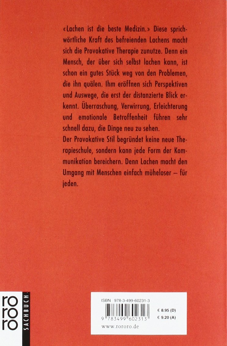 "Lachen ist die beste Medizin." Diese sprichwörtliche Kraft des befreienden Lachens macht sich die "Provokative Therapie" zunutze. Denn ein Mensch, der über sich selbst lachen kann, ist schon ein gutes Stück weg von den Problemen, die ihn quälen. Ihm eröffnen sich Perspektiven und Auswege, die erst der distanzierte Blick erkennt. Überraschung, Verwirrung, Erleichterung und emotionale Betroffenheit führen sehr schnell dazu, die Dinge neu zu sehen. Der "Provokative Stil" begründet keine neue Therapieschule, sondern kann jede Form der Kommunikation bereichern. Denn Lachen macht den Umgang mit Menschen einfach müheloser - für jeden.
