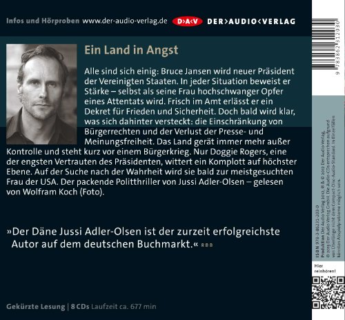 Alle sind sich einig: Bruce Jansen wird neuer Präsident der Vereinigten Staaten. In jeder Situation beweist er Stärke - selbst als seine Frau hochschwanger Opfer eines Attentats wird. Frisch im Amt erlässt er ein Dekret für Frieden und Sicherheit. Doch bald wird klar, was sich dahinter versteckt: die Einschränkung von Bürgerrechten und der Verlust der Presse- und Meinungsfreiheit. Das Land gerät immer mehr ausser Kontrolle und steht kurz vor einem Bürgerkrieg. Nur Doggie Rogers, eine der engsten Vertrauten des Präsidenten, wittert ein Komplott auf höchster Ebene. Auf der Suche nach der Wahrheit wird sie bald zur meistgesuchten Frau der USA. Der packende Politthriller von Jussi Adler-Olsen - gelesen von Wolfram Koch.