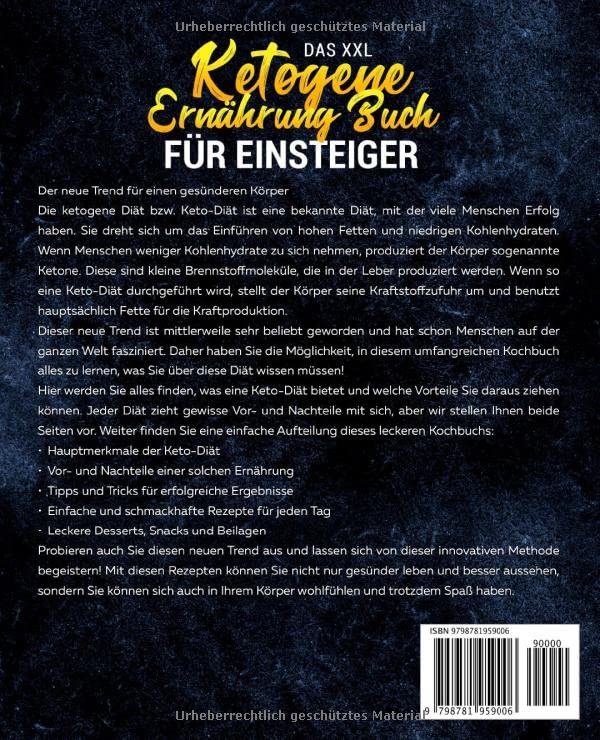 Das XXL Ketogene Ernährung Buch für Einsteiger. Einfache und schmackhafte Keto Rezepte für jeden Tag inkl. Desserts, Snacks und Beilagen. Die ketogene Diät bzw. Keto-Diät ist eine bekannte Diät, mit der viele Menschen Erfolg haben. Sie dreht sich um das Einführen von hohen Fetten und niedrigen Kohlenhydraten. Wenn Menschen weniger Kohlenhydrate zu sich nehmen, produziert der Körper sogenannte Ketone. Diese sind kleine Brennstoffmoleküle, die in der Leber produziert werden. Wenn so eine Keto-Diät durchgeführt wird, stellt der Körper seine Kraftstoffzufuhr um und benutzt hauptsächlich Fette für die Kraftproduktion. Dieser neue Trend ist mittlerweile sehr beliebt geworden und hat schon Menschen auf der ganzen Welt fasziniert. Daher haben Sie die Möglichkeit, in diesem umfangreichen Kochbuch alles zu lernen, was Sie über diese Diät wissen müssen!