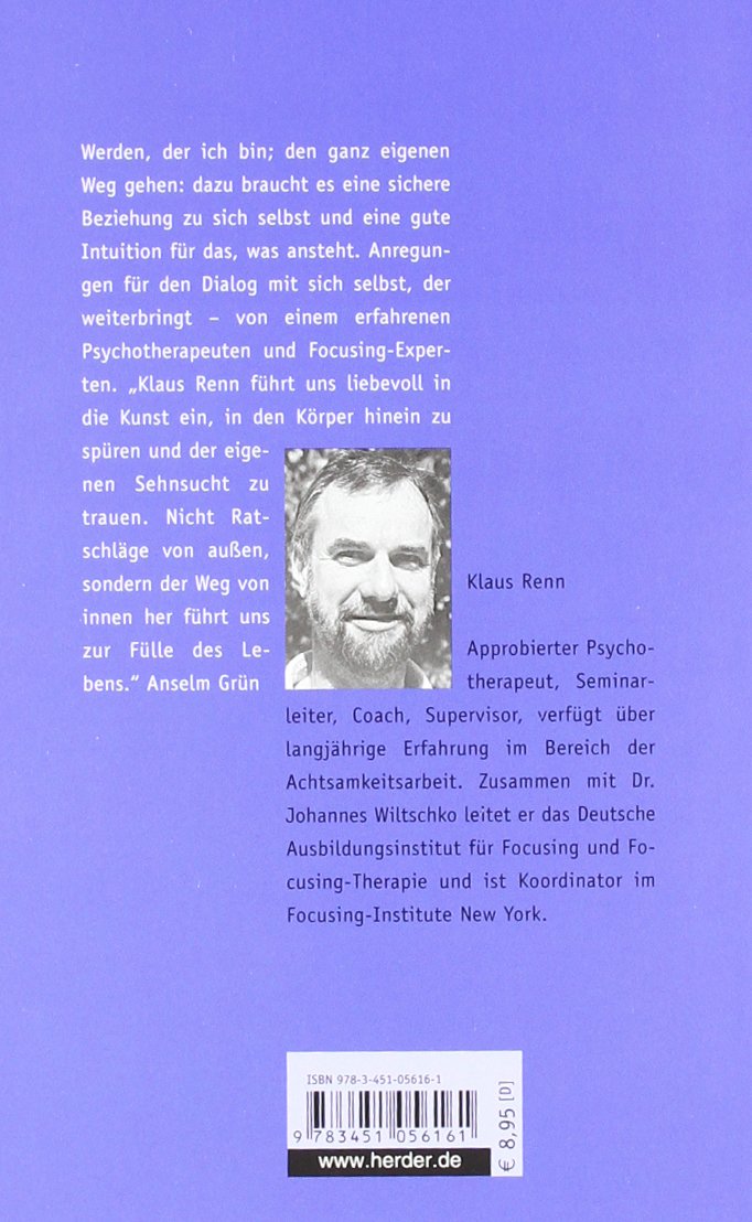 Werden, der ich bin; den ganz eigenen Weg gehen. Dazu braucht es eine sichere Beziehung zu sich selbst und eine gute Intuition für das, was ansteht. Anregungen und Übungen für den Dialog mit sich selbst, der weiterbringt – von einem erfahrenen Psychotherapeuten und Focusing-Experten. Aktualisierte und erweiterte Neuausgabe.