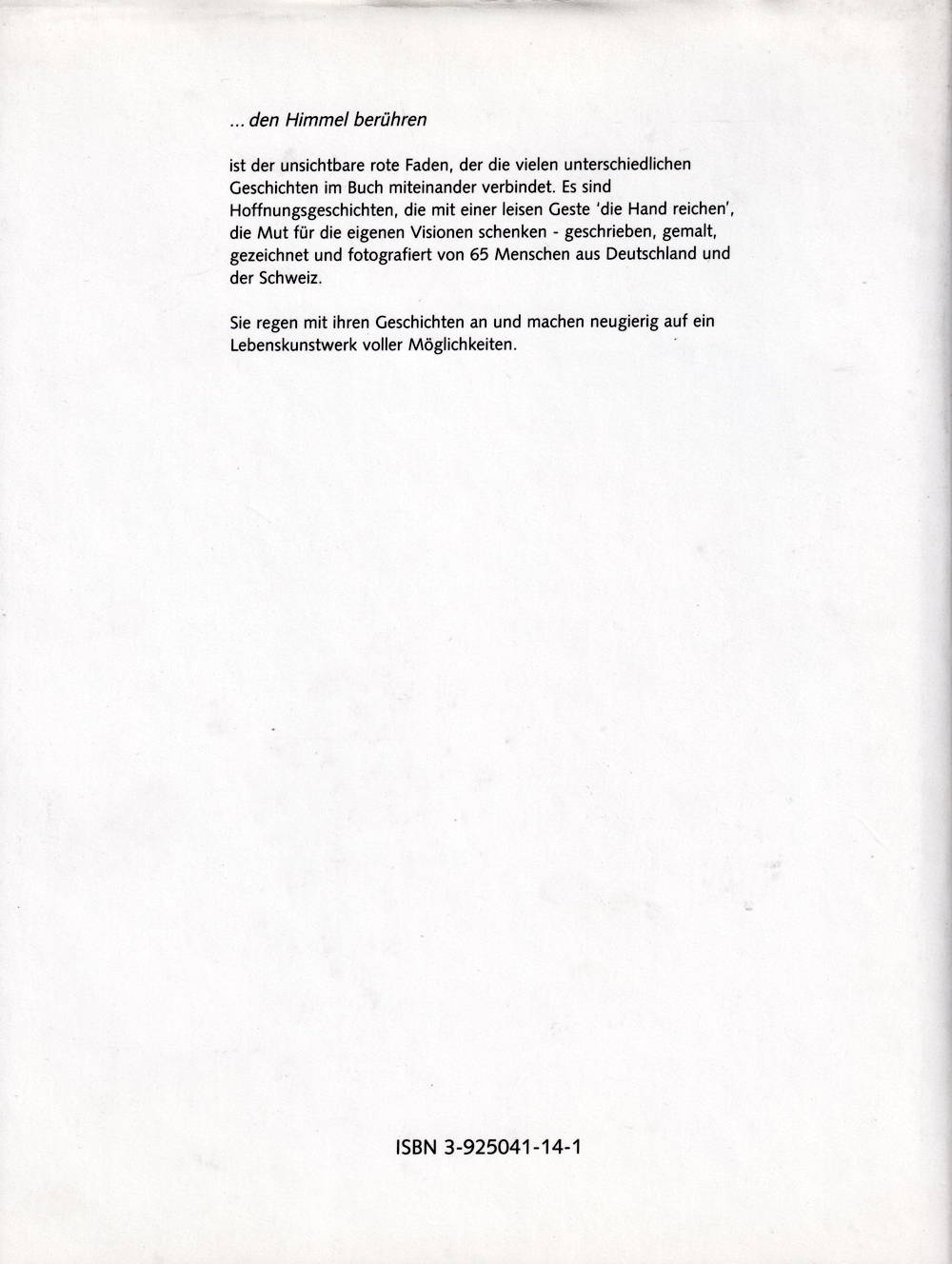 Den Himmel berühren ist der unsichtbare rote Faden, der die vielen unterschiedlichen Geschichten im Buch miteinander verbindet. Es sind Hoffnungsgeschichten, die mit einer leisen Geste 'die Hand reichen', die Mut für die eigenen Visionen schenken geschrieben, gemalt, gezeichnet und fotografiert von 65 Menschen aus Deutschland und der Schweiz.