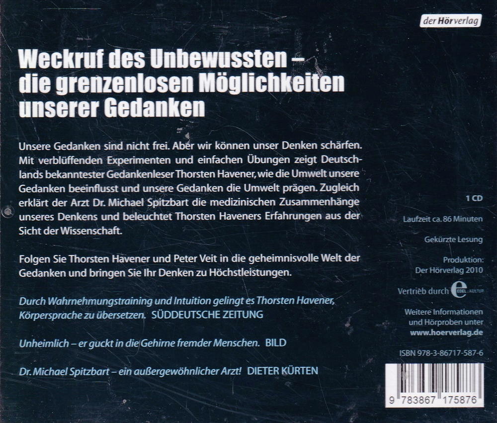 Die Gedanken sind frei. Nein: Unsere Gedanken sind nicht frei. In seinem neuen Buch erläutert der bekannte Gedankenleser Thorsten Havener erstaunliche Tricks und Methoden, unsere Gedanken zu befreien. Anhand verblüffender Experimente und einfacher Übungen zeigt er, wie die Umwelt unsere Gedanken und unsere Gedanken die Umwelt beeinflussen. Bringen Sie Ihr Denken zu Höchstleistung. Eines ist sicher: Ihr Denken wird sich verändern, denn die Gedankenwelt kennt keine Grenzen. Zugleich erklärt der bekannte Arzt und angesehene Gesundheitsexperte Dr. Michael Spitzbart die medizinischen Zusammenhänge unseres Denkens und beleuchtet Thorsten Haveners Erfahrungen aus der Sicht der Wissenschaft. Ein spannender Reiseführer durch die geheimnisvolle Welt der Gedanken.