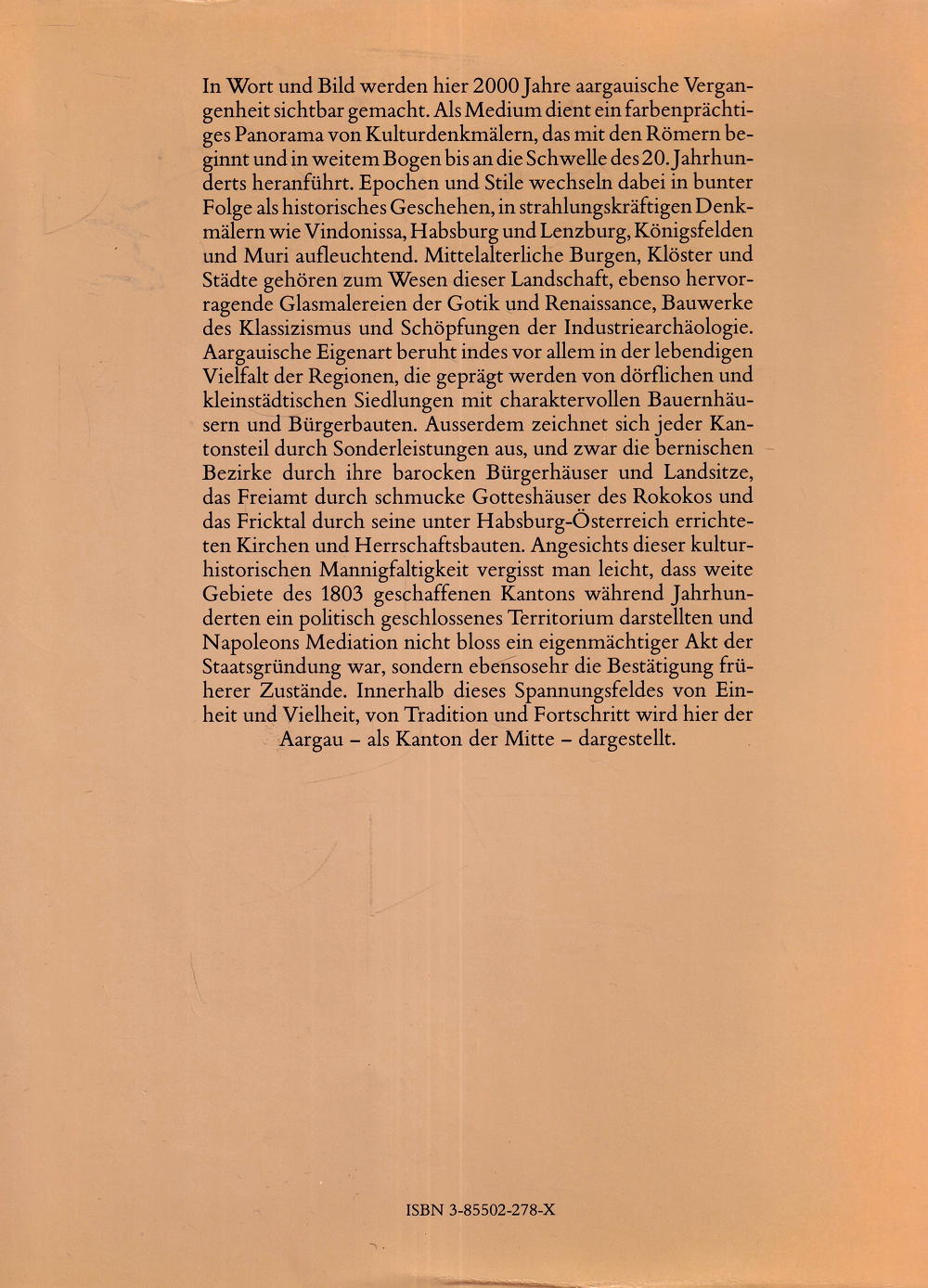 Aargauische Eigenart beruht indes vor allem in der lebendigen Vielfalt der Regionen, die geprägt werden von dörflichen und kleinstädtischen Siedlungen mit charaktervollen Bauernhäusern und Bürgerbauten. Ausserdem zeichnet sich jeder Kantonsteil durch Sonderleistungen aus, und zwar die bernischen Bezirke durch ihre barocken Bürgerhäuser und Landsitze, das Freiamt durch schmucke Gotteshäuser des Rokokos und das Fricktal durch seine unter Habsburg-Österreich errichteten Kirchen und Herrschaftsbauten. Angesichts dieser kulturhistorischen Mannigfaltigkeit vergisst man leicht, dass weite Gebiete des 1803 geschaffenen Kantons während Jahrhunderten ein politisch geschlossenes Territorium darstellten und Napoleons Mediation nicht bloss ein eigenmächtiger Akt der Staatsgründung war, sondern ebensosehr die Bestätigung früherer Zustände. Innerhalb dieses Spannungsfeldes von Einheit und Vielheit, von Tradition und Fortschritt wird hier der Aargau – als Kanton der Mitte - dargestellt.