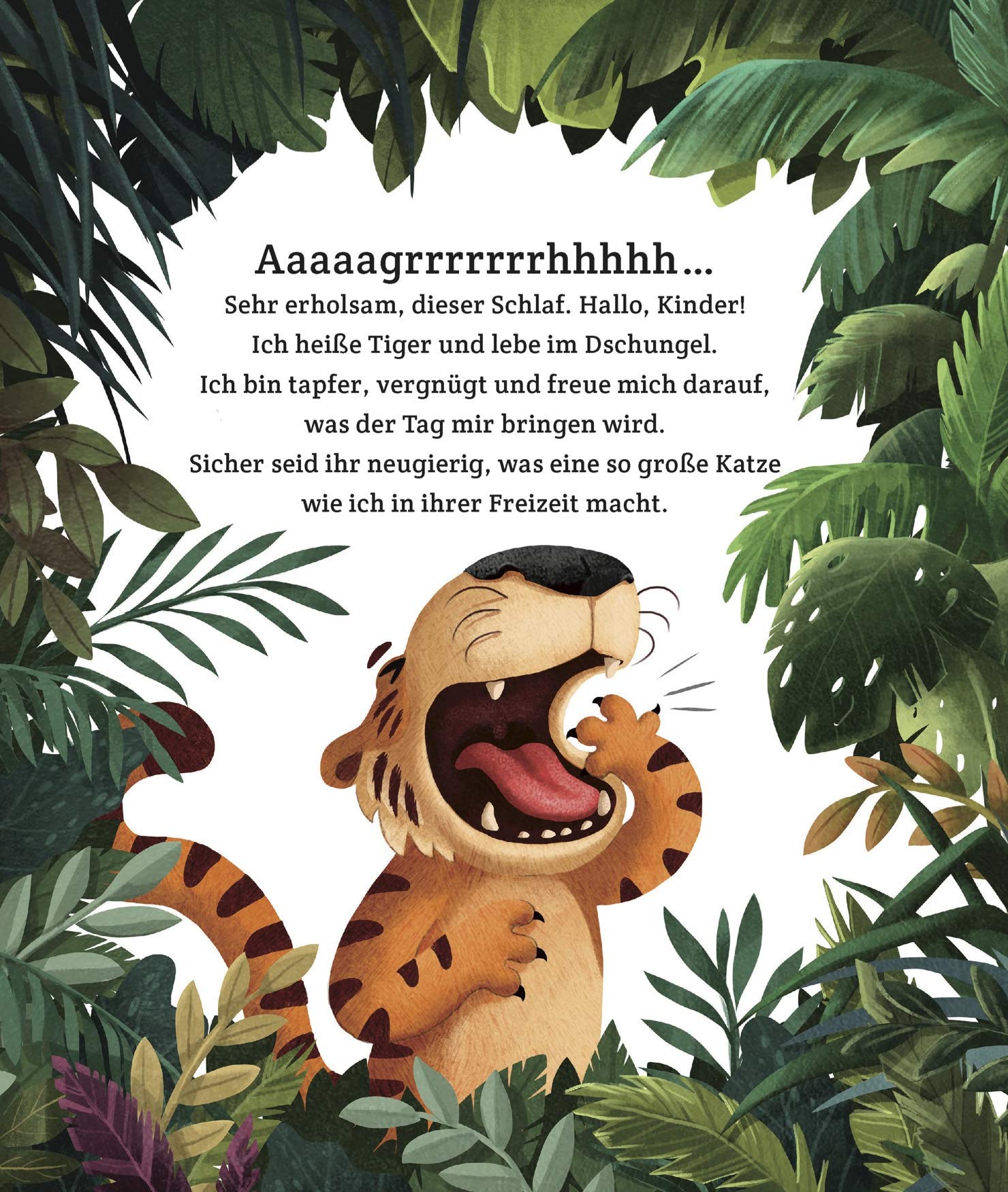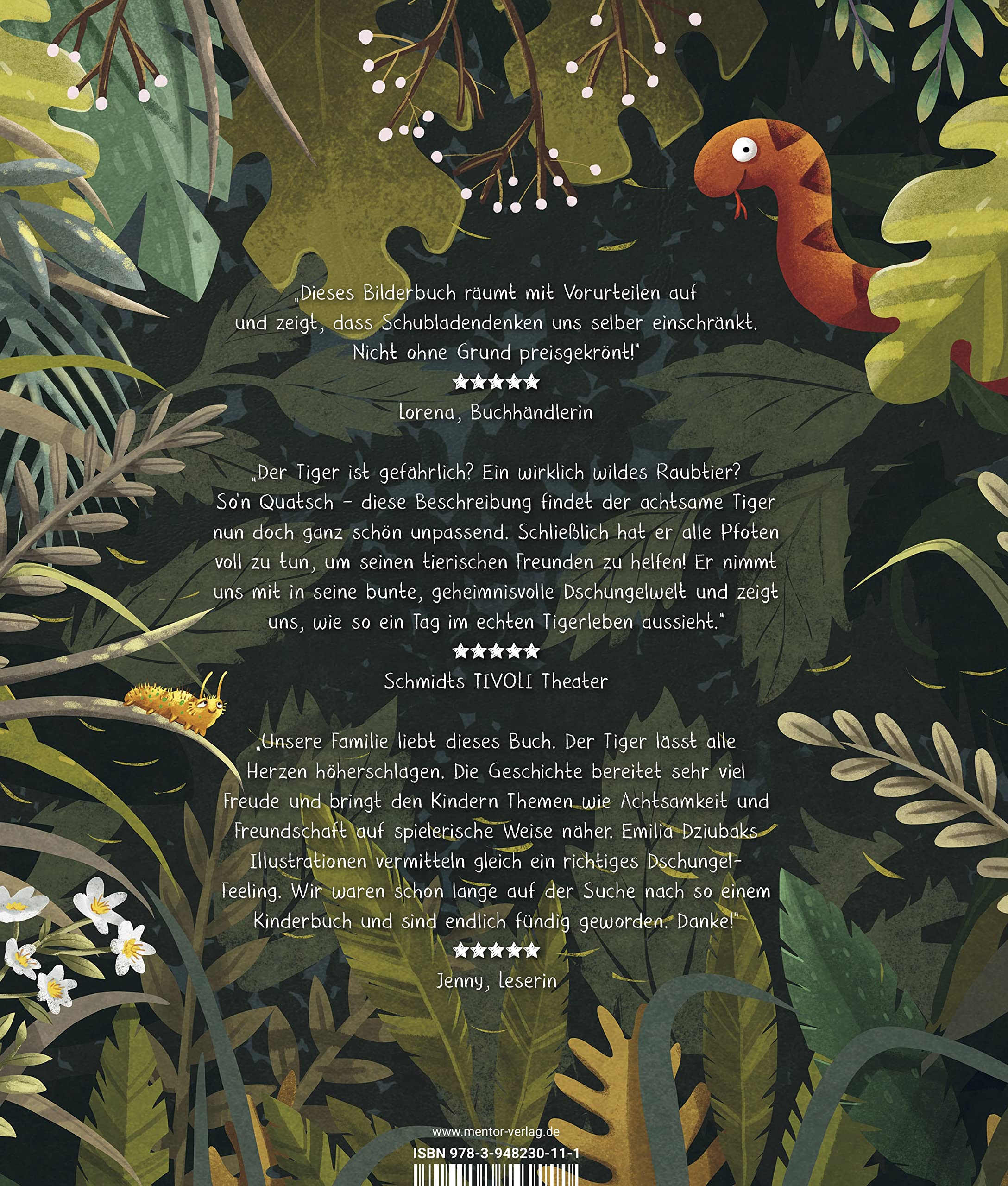 Im Dschungel erzählt man sich, der Tiger sei wild, gefährlich und verschlinge seine Beute genüsslich mit einem Happs. Doch so ganz stimmt das nicht! Denn nachts zeigt der Tiger sein wahres Ich. Er wird zum achtsamen Tiger, den nichts davon abhält, etwas aufzuschlitzen: beispielsweise Obst, damit der kleine Elefant seinen Salat bekommt. Ausserdem schleicht er herum, um Orang-Utans zu frisieren, Ameisen zum perfekten Bau zu verhelfen, mit Tapiren zu tanzen oder um Papageien-Eier behutsam auszubrüten. So viele gute Taten machen dann sogar einen achtsamen Tiger sehr müde. Bestseller-Autor Przemysław Wechterowicz enthüllt in diesem wilden Kinderbuch über Tiere das geheime Leben der Tiger. Und das ist ganz anders, als erwartet. Und - seid ihr bereit für den achtsamen Tiger, der nur mit ganz viel Liebe zubeisst? Unvorhergesehene & lustige Handlung: perfekt zum Vorlesen für Kita-Kinder Farbenprächtige Illustrationen von Emilia Dziubak: entführt kleine Leser*innen direkt in den Dschungel Achtsamkeit für Kinder: thematisiert Freundschaft, aufmerksames Verhalten und innere Werte Gute-Nacht-Geschichte mit magischen, leicht verständlichen Worten für Kinder ab 3 Jahren Für kreative Tiger: Malbuch als PDF zum Download Bestseller auf Amazon: 750+ Bewertungen (4, 1 Sterne) Wer hat Vorurteile über Tiger? Ein Bilderbuch mit einer verblüffenden Wendung Wer hätte das gedacht: Der vermeintlich böse Tiger ist beliebt! Denn ganz entgegen der Erwartungen an eine Raubkatze verbringt er seine Nächte damit, Freunde zu treffen und Gutes zu tun. Die Tiger-starke Dschungelgeschichte erinnert kleine und grosse Leser daran, zu welch positiven Überraschungen jeder fähig sein kann. Die lustigen und unerwarteten Handlungen sind dabei ein grosser Spass für die gemeinsame Vorlesezeit daheim oder im Kindergarten! Meinungen »Eine magische Geschichte, die Kindern zeigt, dass es vor allem auf die inneren Werte ankommt. « Leserin »Emilia Dziubaks Illustrationen sind einfach wundervoll. Ein Kinderbuch, das Kinder (und Eltern) glücklich macht!« Leserin