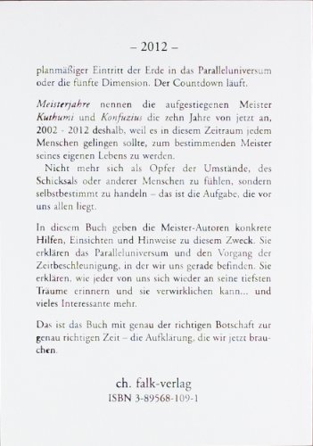 Meisterjahre nennen die aufgestiegenen Meister Kuthumi und Konfuzius die zehn Jahre von jetzt an, 2002 - 2012 deshalb, weil es in diesem Zeitraum jedem Menschen gelingen sollte, zum bestimmenden Meister seines eigenen Lebens zu werden.