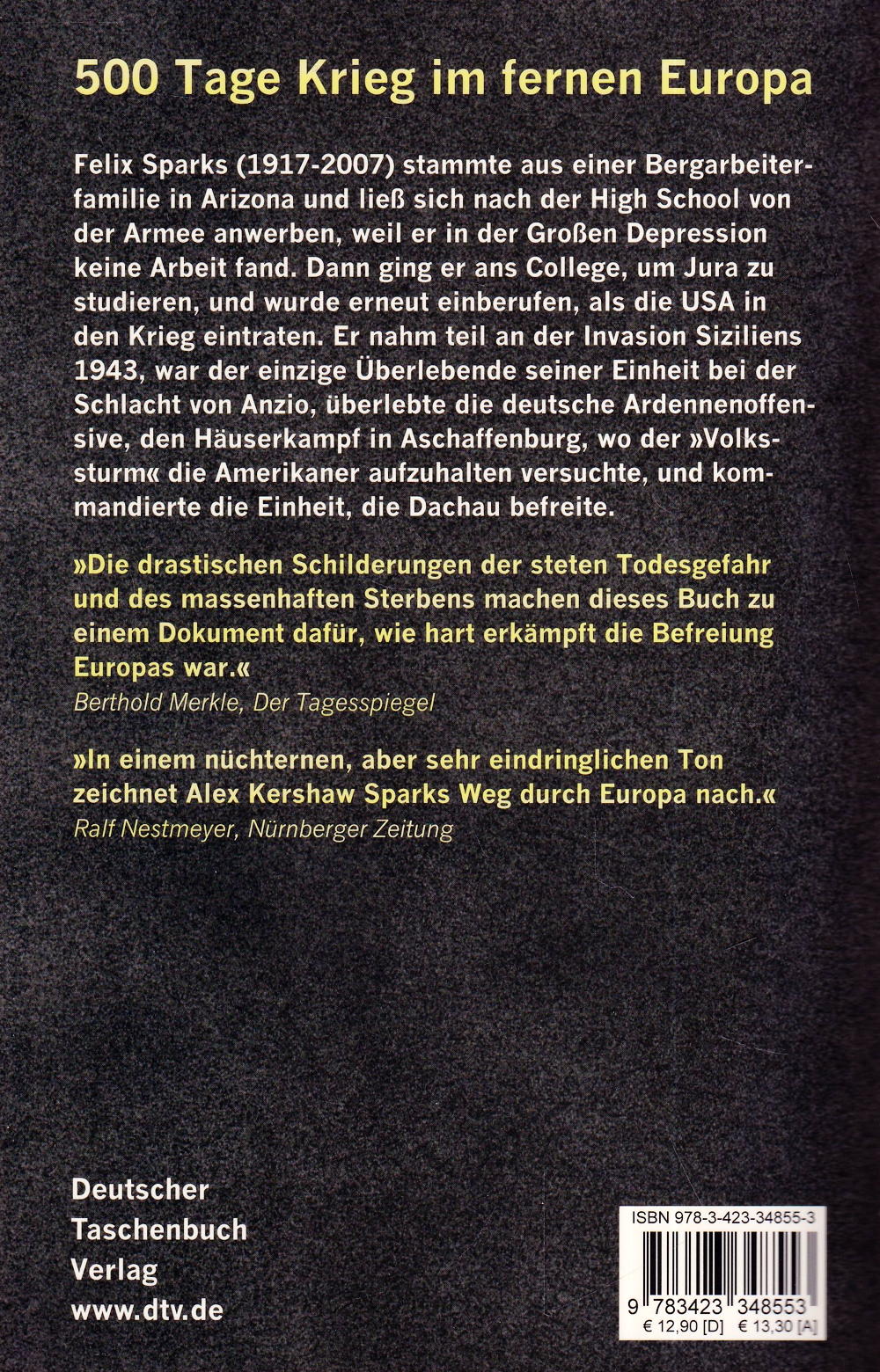 Felix Sparks (1917-2007) stammte aus einer Bergarbeiterfamilie in Arizona und liess sich nach der High School von der Armee anwerben, weil er in der Grossen Depression keine Arbeit fand. Dann ging er ans College, um Jura zu studieren, und wurde erneut einberufen, als die USA in den Krieg eintraten. Er nahm teil an der Invasion Siziliens 1943, war der einzige Überlebende seiner Einheit bei der Schlacht von Anzio, überlebte die deutsche Ardennenoffensive, den Häuserkampf in Aschaffenburg, wo der "Volkssturm" die Amerikaner aufzuhalten versuchte, und kommandierte die Einheit, die Dachau befreite.